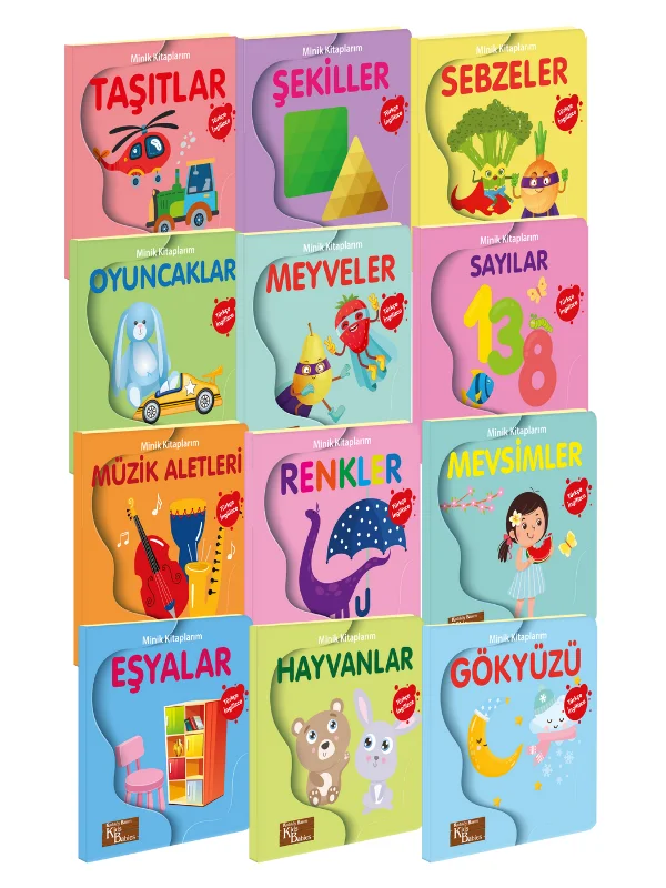 Minik Kitaplarım Bebeğimin Minik Kitapları seti, 0-3 yaş çocuklar için iki dilli, eğlenceli ve eğitici içeriklerle erken yaşta dil ve zihinsel gelişimi destekleyen 12 kitaplık bir set sunar.