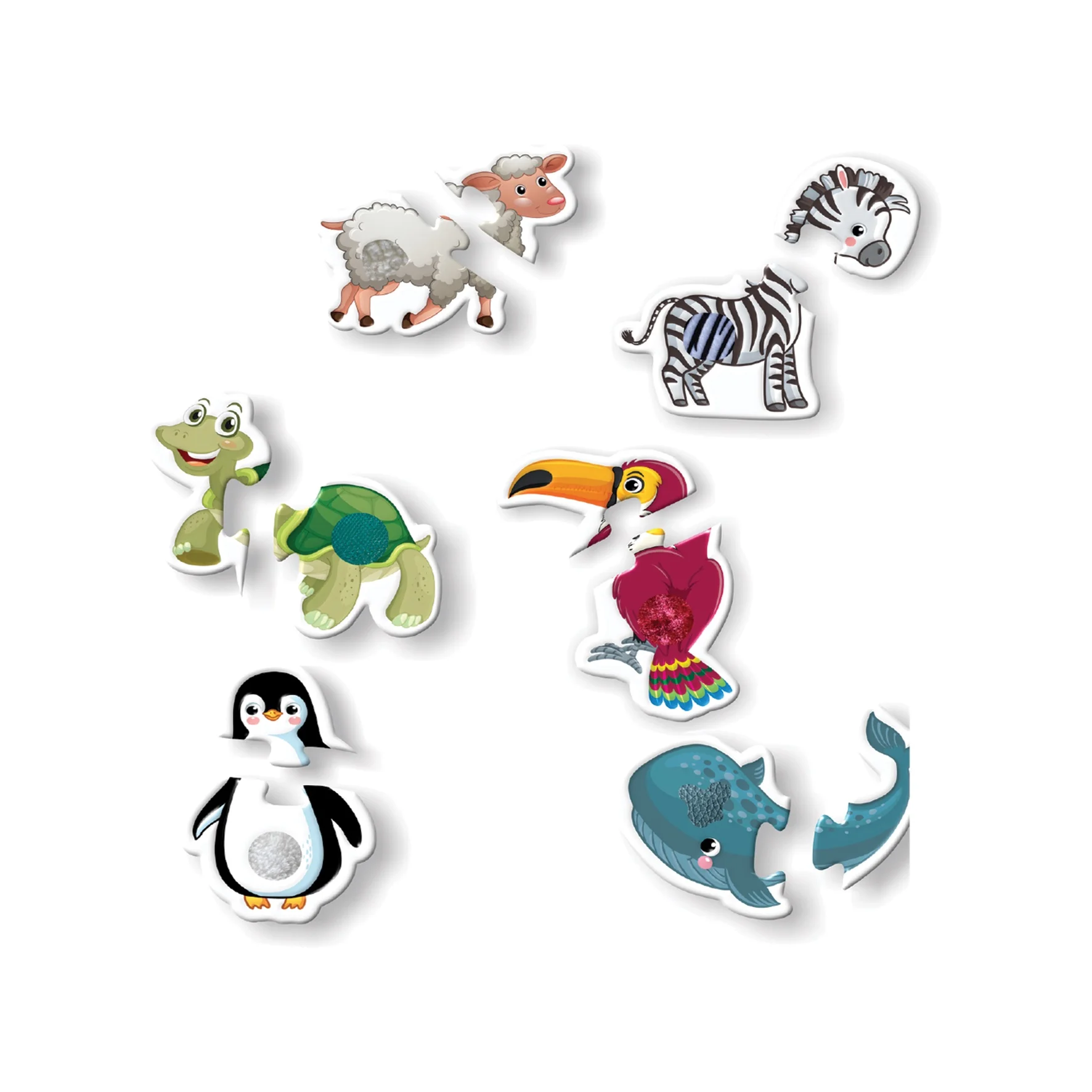 Toplam 12 parçalı dokun-hisset baby puzzle, 1+ yaş çocuklar için tasarlanmış olup, dokulu parçalarıyla duyusal gelişimi ve ince motor becerileri desteklerken hayvanları tanıma fırsatı sunar.