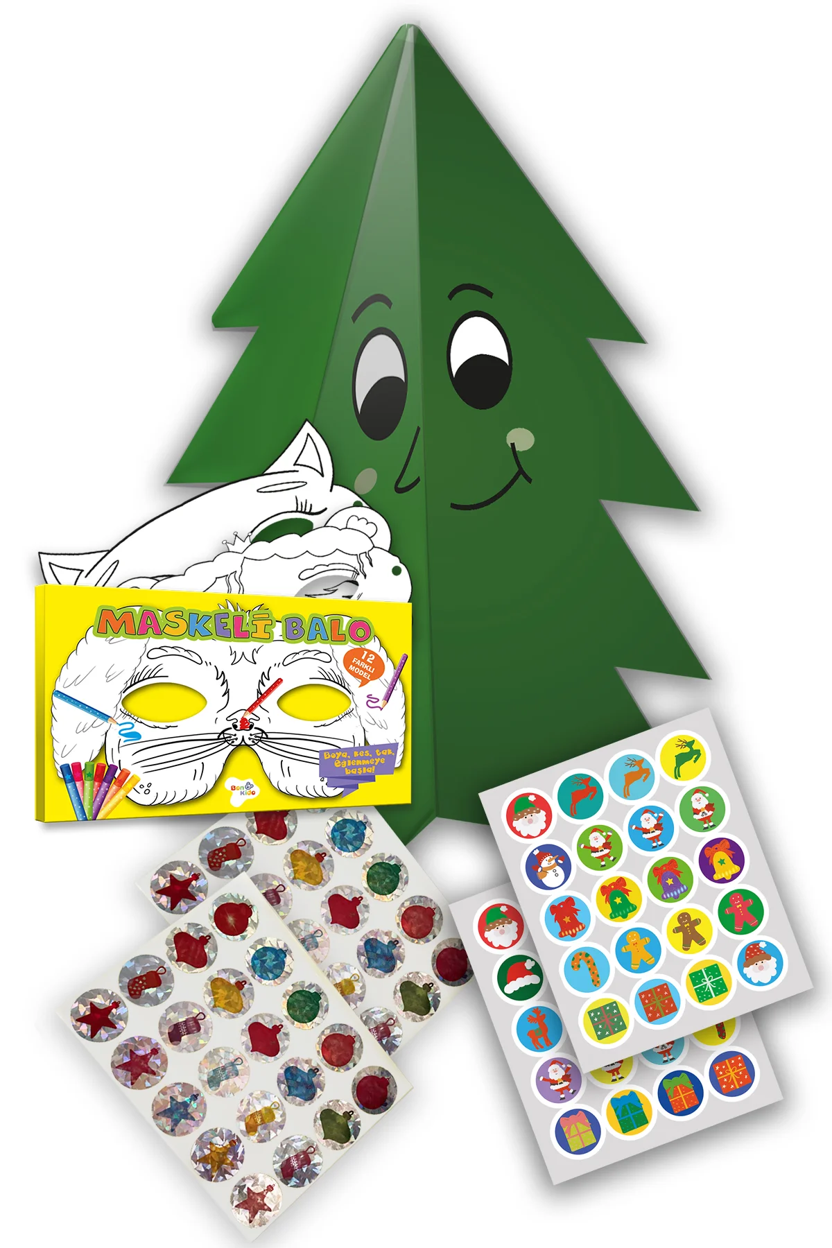 Bonkido’nun yılbaşı temalı çam ağacı ve maske kitabı, 2+ yaş çocuklar için 80 sticker ve 12 farklı maskeyle eğlenceli bir süsleme ve boyama deneyimi sunar.
