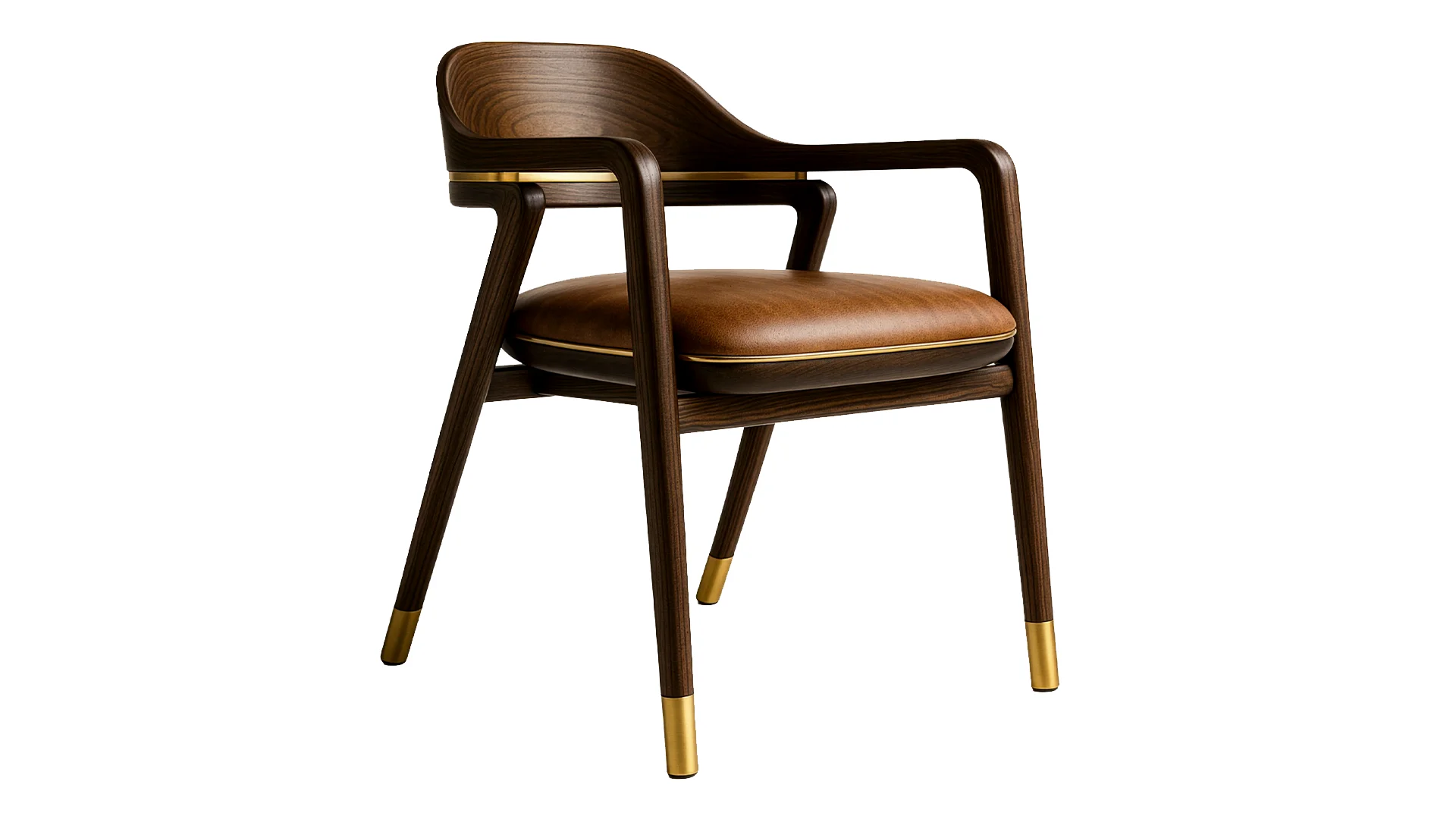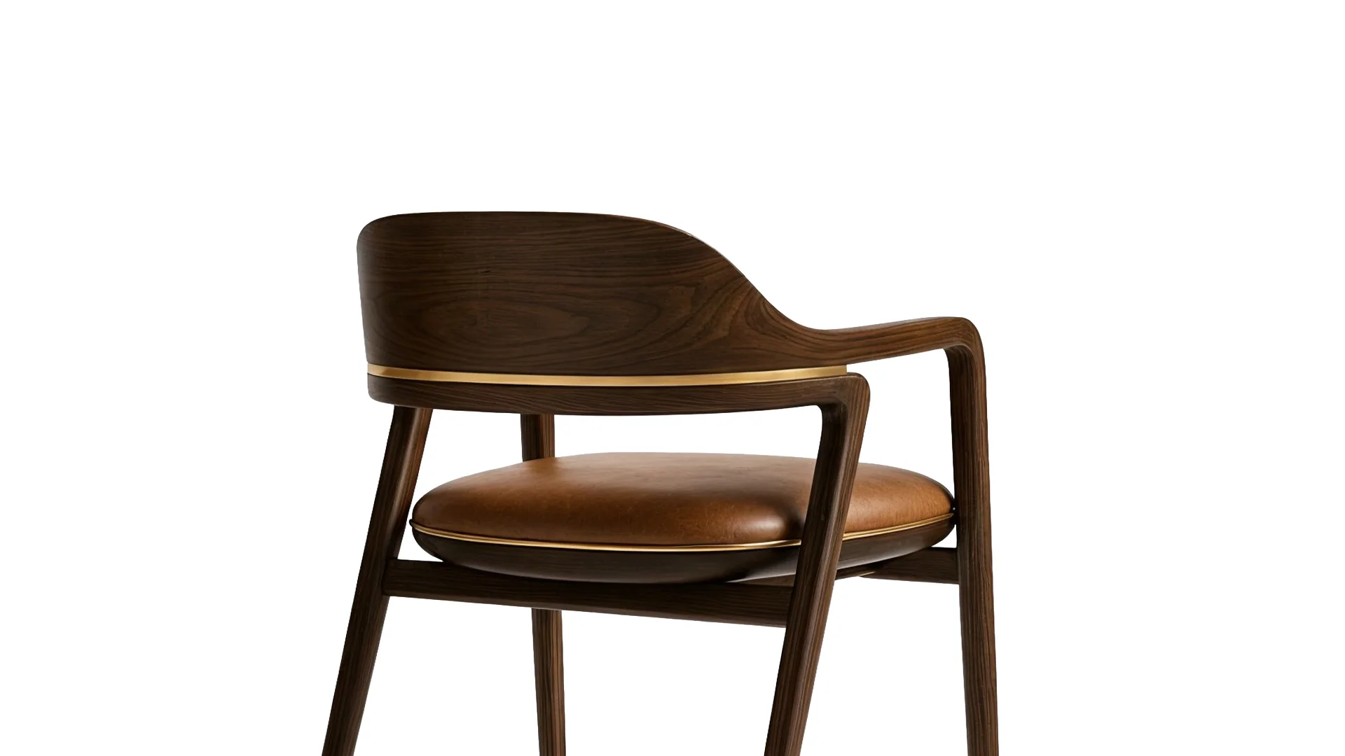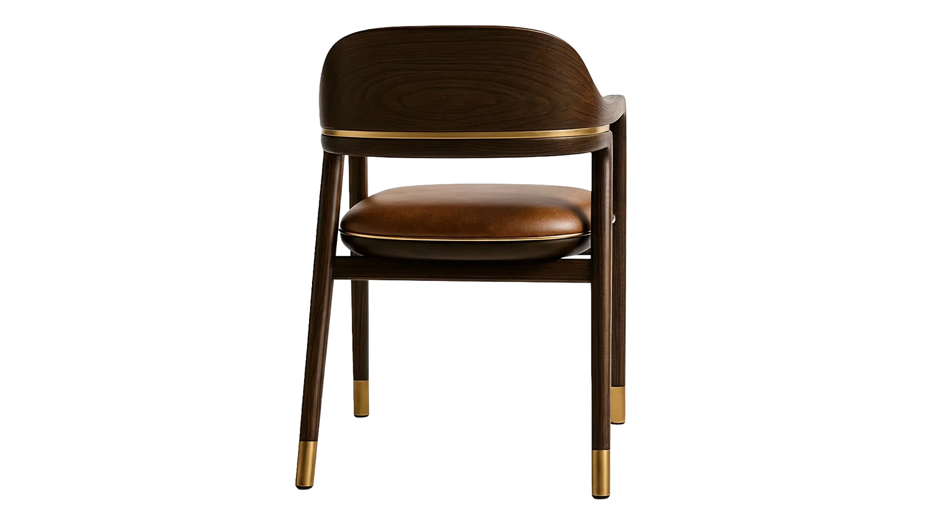 The Angela Chair is crafted from rich solid walnut, showcasing a beautifully sculpted backrest and seamless arm transitions that highlight its refined,contemporary form. Subtle brass accents at the joints and leg tips elevate the design, adding a touch of understated luxury. Its upholstered seat providessupportive comfort, making the Angela Chair a versatile piece for dining spaces, studios or refined hospitality settings.
