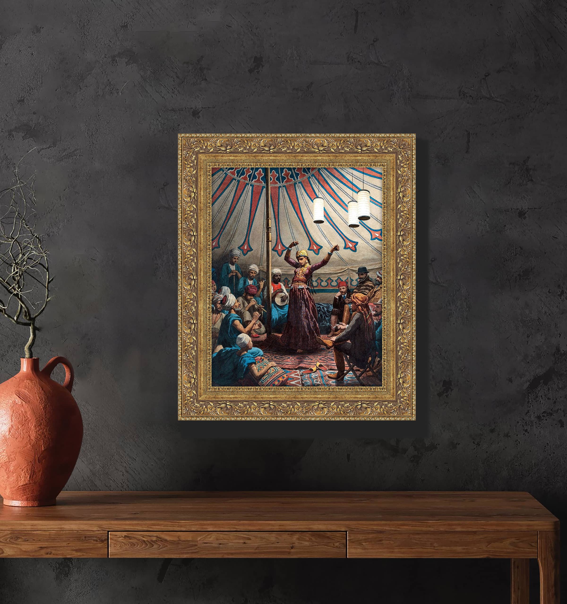 Bu tablo, bir çadırın içinde gerçekleştirilen bir dans performansını göstermektedir. Görüntüde, çadırın ortasında dans eden bir kadın, onu izleyen ve müzik çalan bir grup erkek ile çevrelenmiştir. Dansçı kadın, dönemin geleneksel giysilerini giymiş ve müzik ritmiyle uyumlu hareketlerle dans etmektedir. Çadırın içinde yer alan figürler arasında farklı kıyafetler ve aksesuarlar yer almakta, bu da sahnenin egzotik ve çok kültürlü bir atmosfer yaratmasını sağlamaktadır.
