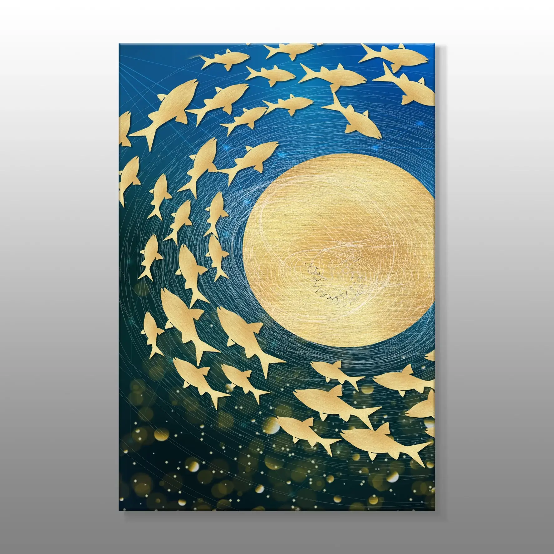 Altın Ay ve Balıklar Soyut Kanvas Baskı Tablo, parlak altın ay figürü, suyun huzurunu simgelerken zarif balık deseni ile birleştirilmiştir. Hem doğanın hem de modern sanatın bir araya getirildiği eşsiz bir tablo olarak altın renginin ihtişamıyla balıkların akıcı hareketini yansıtıyor. Altın ay figürü, gizemi ve geceyi temsil ederken, balıkların serbest bir şekilde yüzdüğü desenler, esere sakinlik ve derinlik katar. Tablo, çağdaş ve minimalist mekanlar için mükemmel bir tercih olmakla beraber dikkat çekici bir dekorasyon öğesi olarak öne çıkar. Her baktığınızda size gece gökyüzünü ve denizlerin derinliğini anımsatacak bu tablo, eğlenceli ve modern bir atmosfer oluşturuyor. Galeri Gusto’nun bu tablosu, mekâna doğanın güzelliği ile sanatsal zarafetini getirecek.