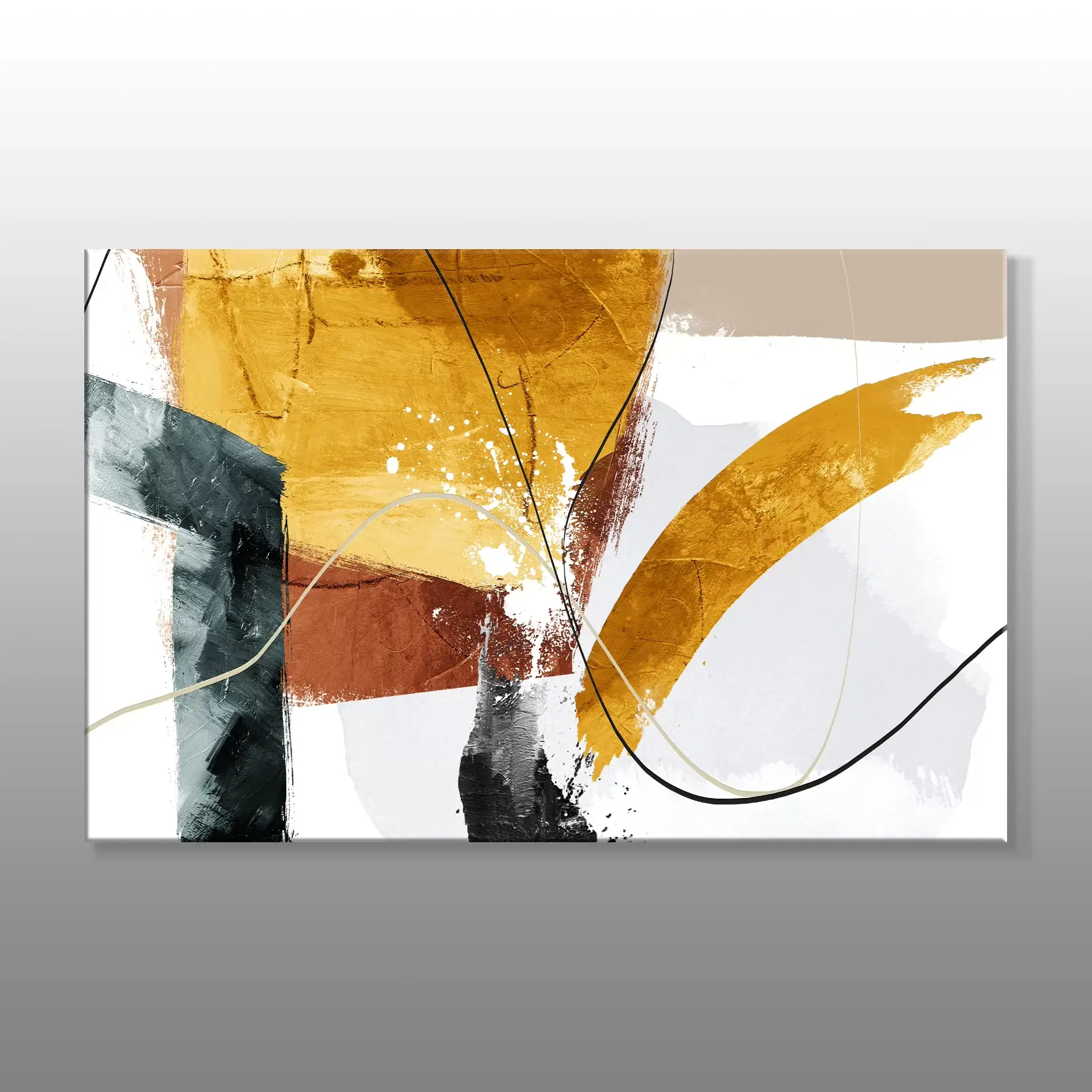 Altın Fırça Darbeleri Ve Siyah Çizgiler Soyut Kanvas Baskı Tablo