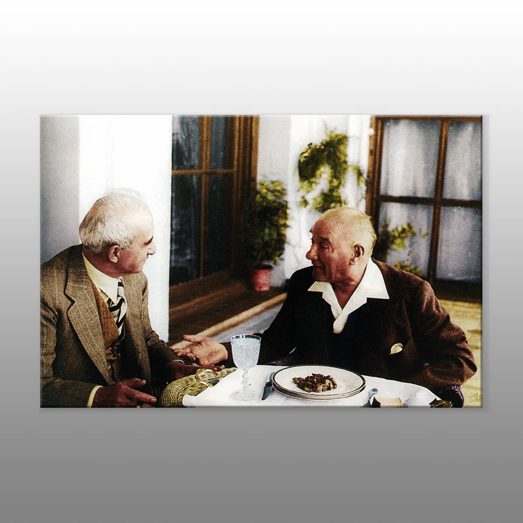 “Atatürk ve İnönü Fotoğrafı Kanvas Tablo”, Türkiye Cumhuriyeti’nin kurucusu Mustafa Kemal Atatürk ile dönemin önemli siyasi figürlerinden İsmet İnönü'nün samimi bir anını yansıtan tarihi bir eserdir. Bu ikonik fotoğraf, iki büyük liderin birlikte paylaştığı bir anı ölümsüzleştirirken, bir halkın ve bir ulusun geleceği için verdikleri mücadeleleri simgeliyor. Fotoğrafta Atatürk ve İnönü'nün dostane sohbeti, Türkiye'nin modernleşme sürecindeki güçlü birlikteliği ve kararlılığı vurgular.
