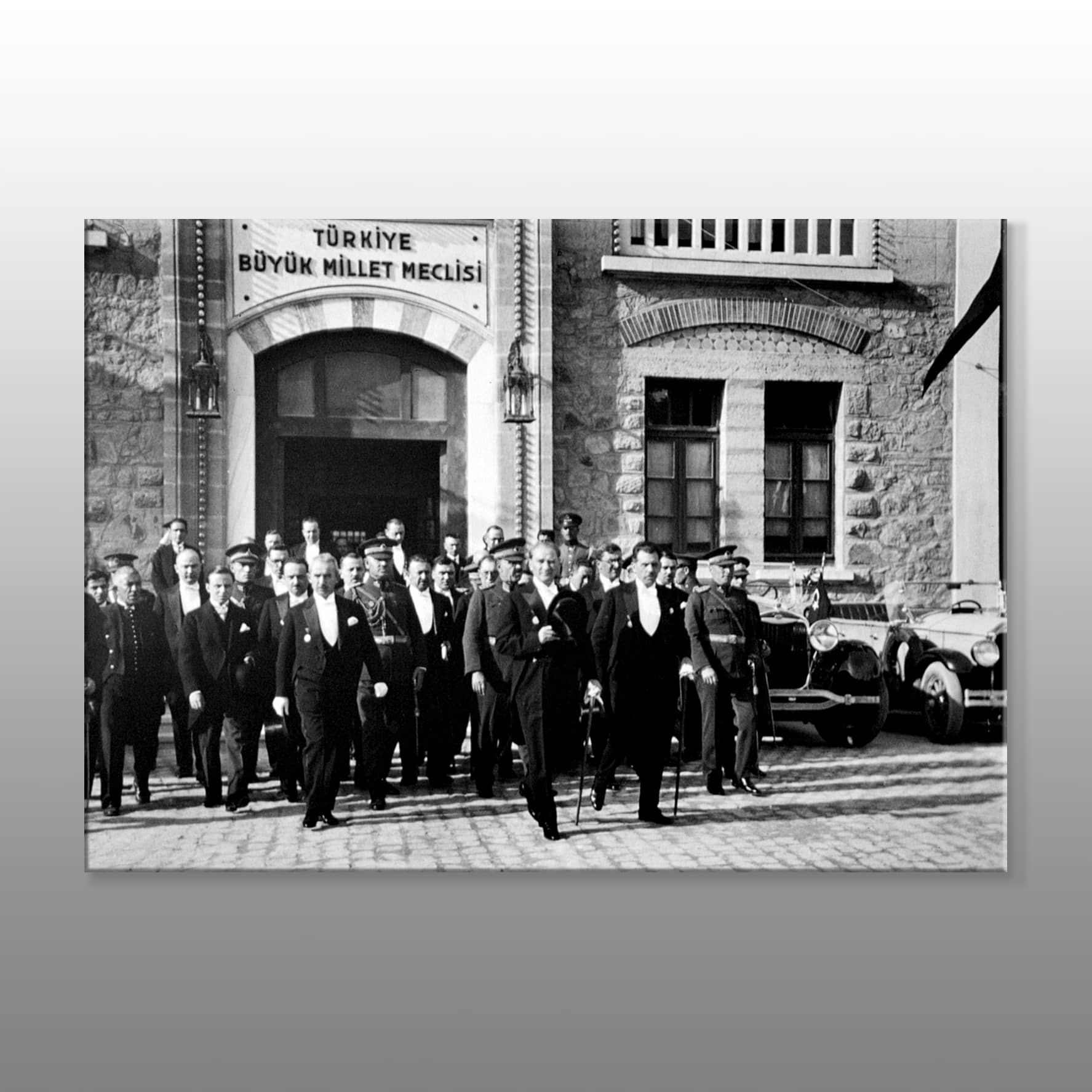 “Atatürk ve Meclis Fotoğrafı Kanvas Tablo”, Türkiye Cumhuriyeti'nin kurucusu Mustafa Kemal Atatürk'ün, milli mücadelenin önemli adımlarından birini attığı bir anı ölümsüzleştiren tarihi bir eserdir. Bu fotoğraf, Atatürk’ün öncülüğünde kurulan Türkiye Büyük Millet Meclisi’nin ilk yıllarındaki önemli bir dönüm noktasını yansıtmaktadır. Atatürk ve beraberindeki hükümet yetkilileriyle birlikte TBMM binasından çıkan bu grup, Cumhuriyet’in inşası için atılan güçlü adımların simgesidir.