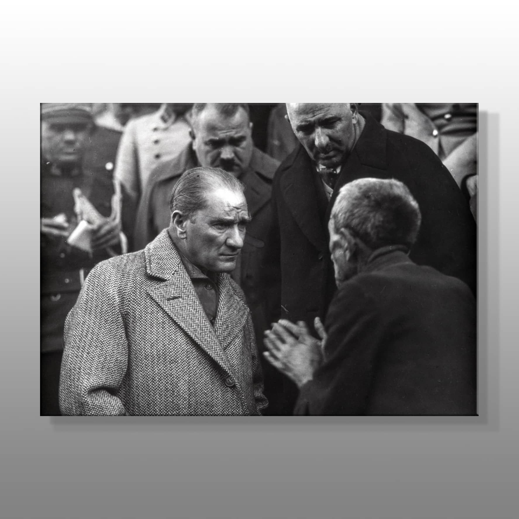 Her bir fotoğraf, ustalıkla dijital kanvas üzerine aktarılmış; netlik ve detaylar en ince ayrıntısına kadar korunmuş. Siyah-beyazın zamansız asilliği, Atatürk’ün karizmatik duruşunu ve tarihsel önemini ön plana çıkarıyor. Evinizde, ofisinizde ya da resmi mekanlarda sergileyebileceğiniz bu eser, geçmişe saygıyı modern dekorasyonla buluşturuyor.