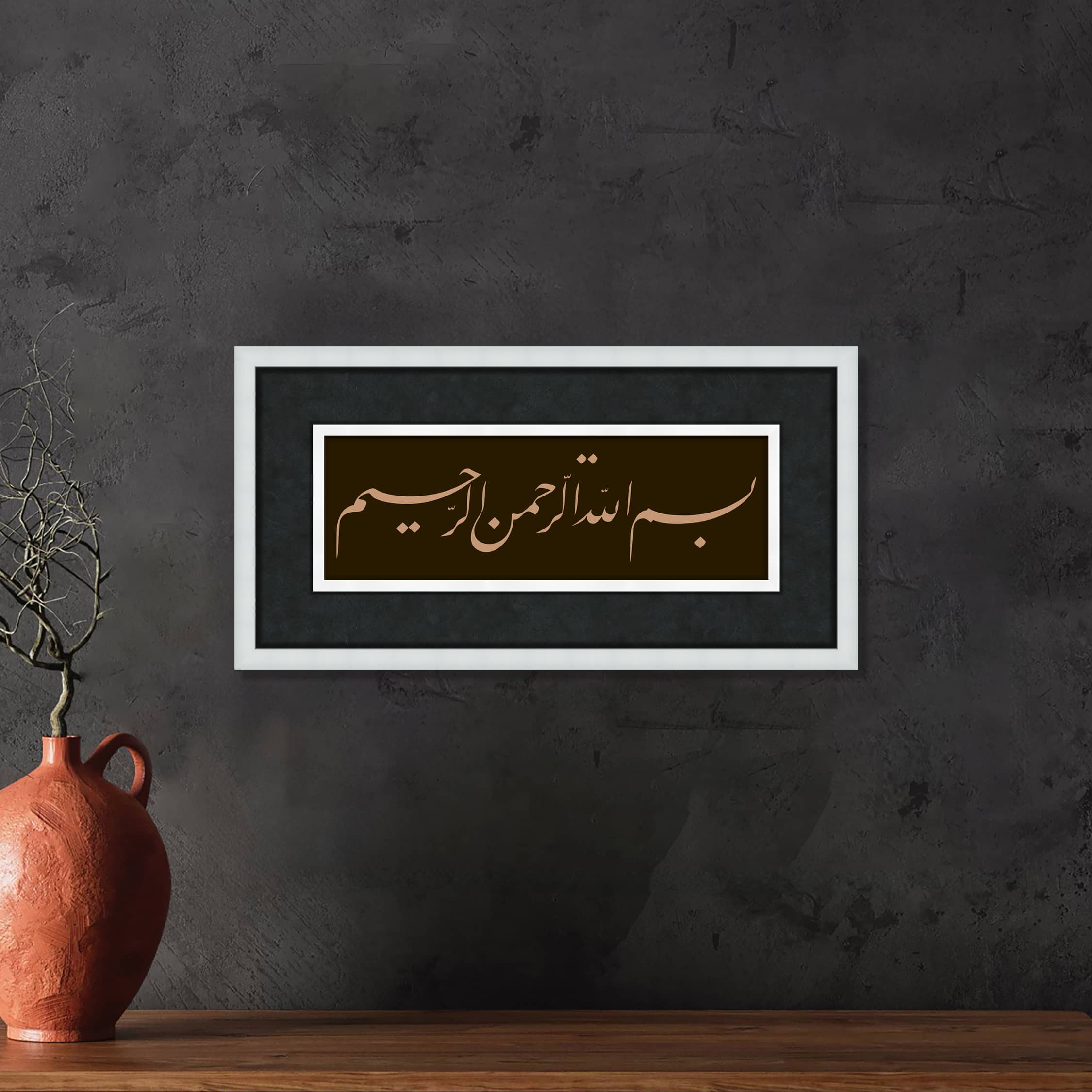 Eser Bilgileri, Okunuşu: Bismillâhirrahmânirrahîm Anlamı: "Rahmân ve Rahîm olan Allah'ın adıyla." Çerçeve , Lamine Çerçeveden üretilmiştir. Çift katmanlı çerçeve kırık beyaz renginde, derinlikli çeçreve kullanılmıştır, Baskı, Hahnemühle, Stüdio Enhenced 190 gr /m² Kağıt Kullanılmıştır. Paspartu; 6 cm Siyah İthal 17 micron kağıt kullanılmıştır. Cam, 2 mm Normal Cam Kullanılmıştır.