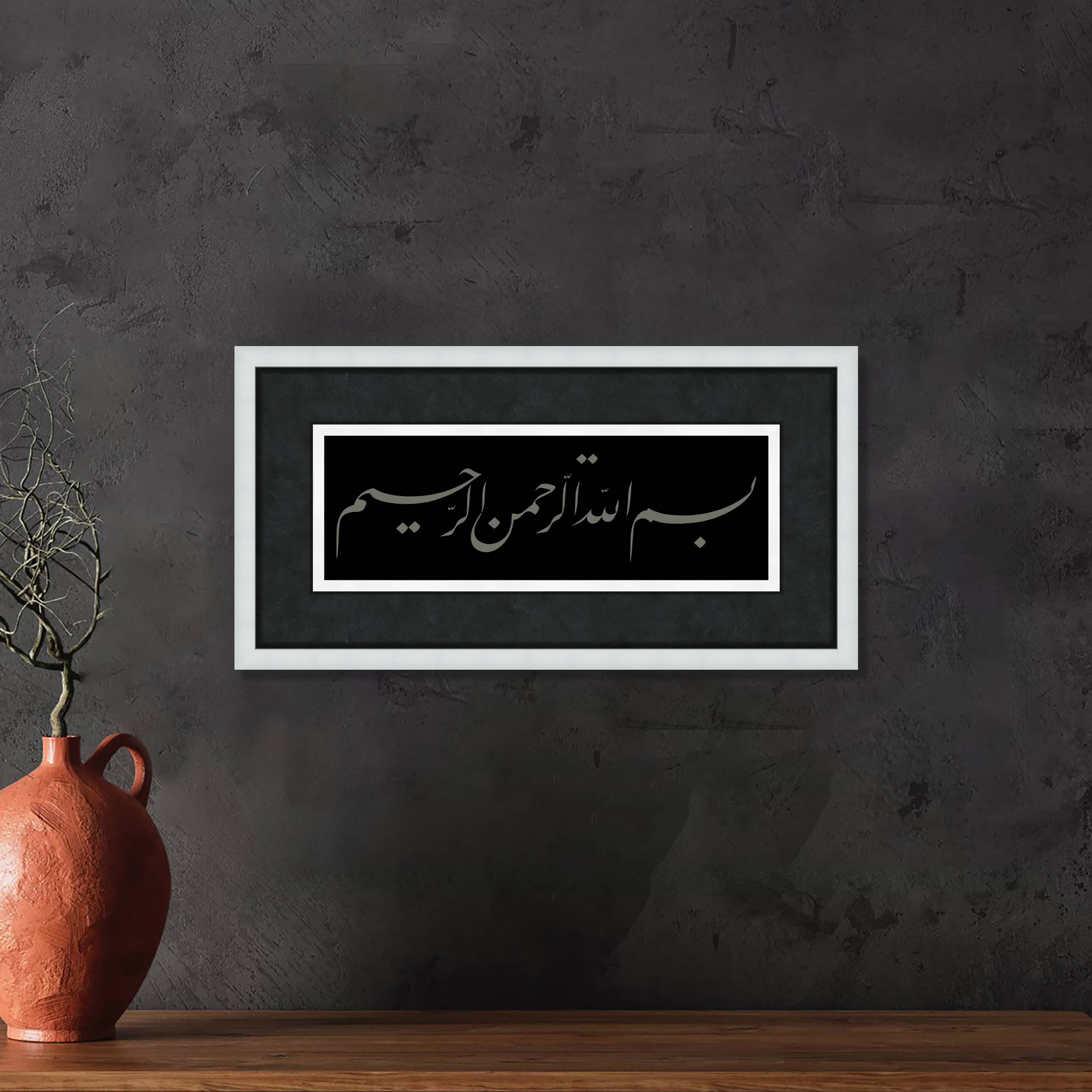 Eser Bilgileri, Okunuşu: Bismillâhirrahmânirrahîm Anlamı: "Rahmân ve Rahîm olan Allah'ın adıyla." Çerçeve , Lamine Çerçeveden üretilmiştir. Çift katmanlı çerçeve kırık beyaz renginde, derinlikli çeçreve kullanılmıştır, Baskı, Hahnemühle, Stüdio Enhenced 190 gr /m² Kağıt Kullanılmıştır. Paspartu; 6 cm Siyah İthal 17 micron kağıt kullanılmıştır. Cam, 2 mm Normal Cam Kullanılmıştır.