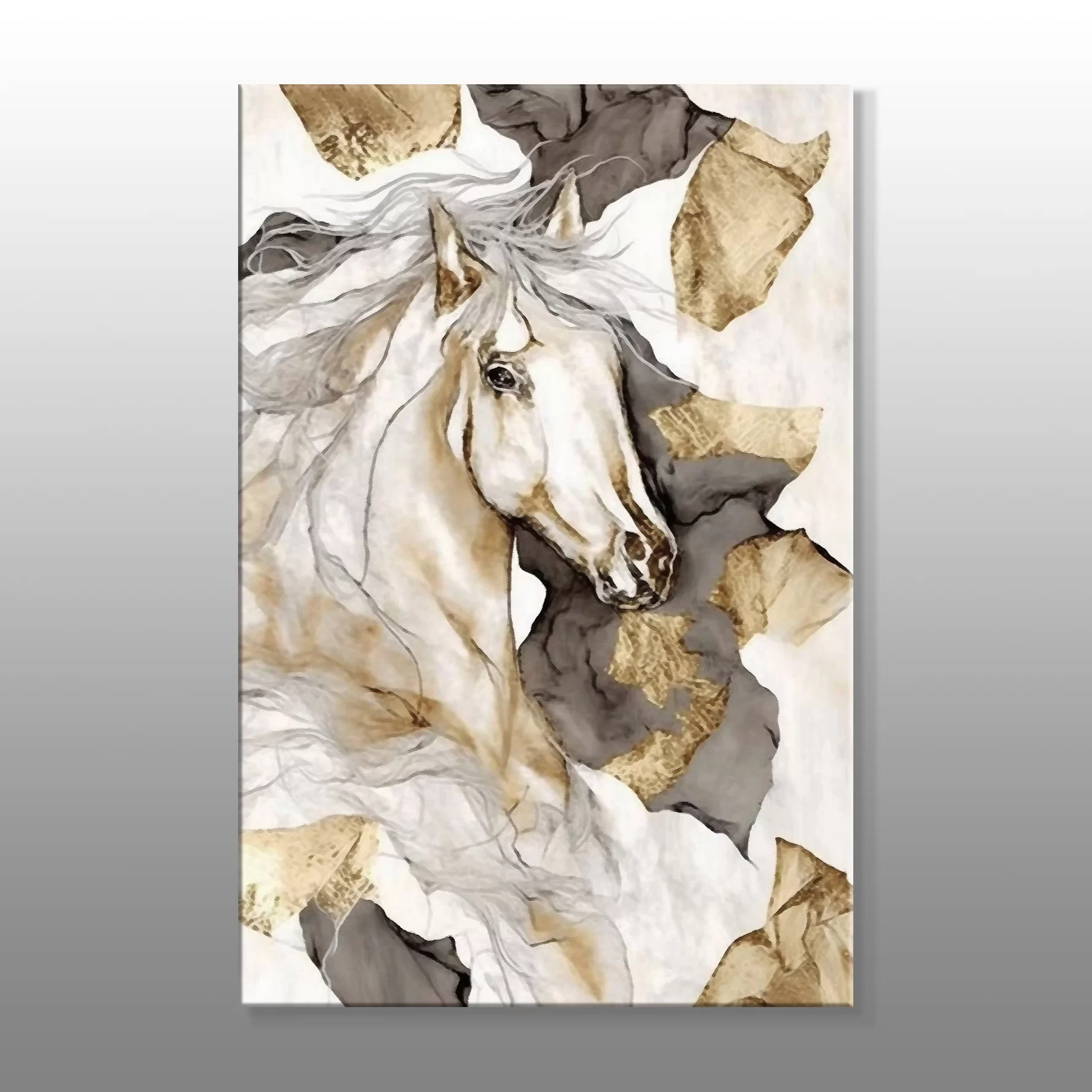 Beyaz Yeleli Altın Renkli At Soyut Kanvas Baskı Tablo