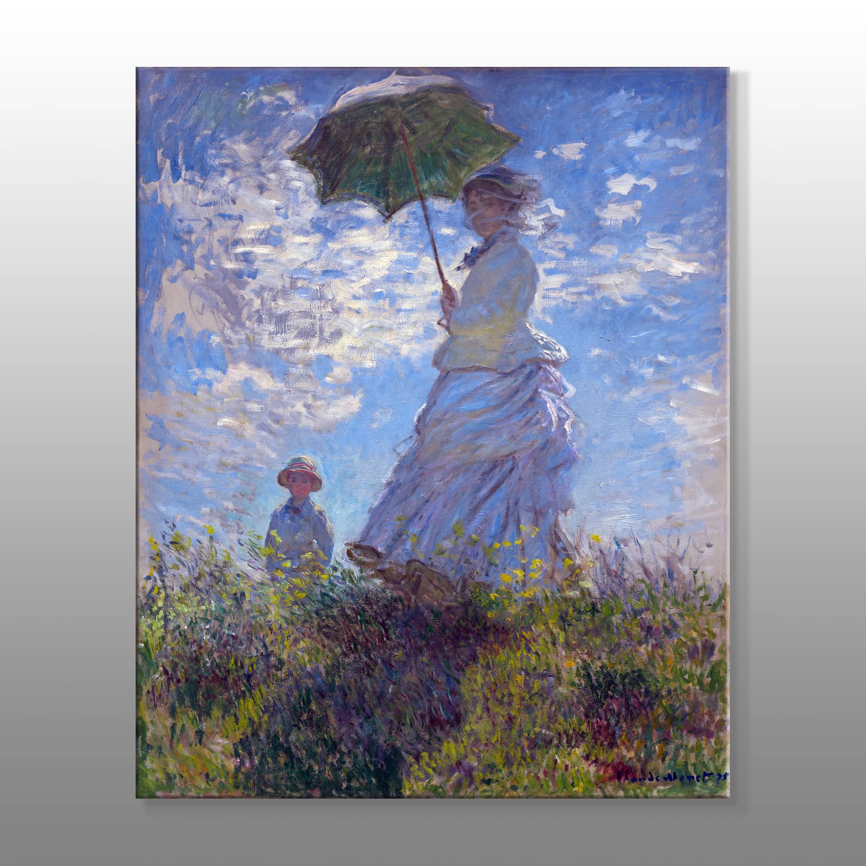 Claude Monet Women with a Parasol ürünü, Claude Monet'nin 1875'te yaptığı "Women with a Parasol" (Şemsiyeli Kadın), sanatçının en sevilen ve ikonik eserlerinden biridir. Bu tablo, Monet’nin empresyonist (izlenimci) tarzını mükemmel bir şekilde yansıtarak, o anın duygusunu ve atmosferini izleyiciye hissettirmeyi amaçlar. Eserde, Monet'nin eşi Camille ve oğlu Jean bir tepe üzerinde resmedilmiştir. Camille, rüzgârda dalgalanan beyaz bir elbise giymekte ve bir şemsiye tutmaktadır; oğlu Jean ise arka planda görünmektedir. Monet, bu eserde güneş ışığının etkilerini ve doğanın güzelliklerini yakalamak için hızlı, kısa ve hareketli fırça darbeleri kullanır. Güneş ışığının ve gölgelerin oyunu, özellikle şemsiyenin altındaki yüzeylerde, kadının elbisesinde ve çimenlerde görülür. Gökyüzündeki bulutlar, tıpkı kadının elbisesi gibi hafif bir rüzgârın etkisiyle hareket ediyor gibi görünür, bu da tabloya anlık bir canlılık ve dinamizm kazandırır.