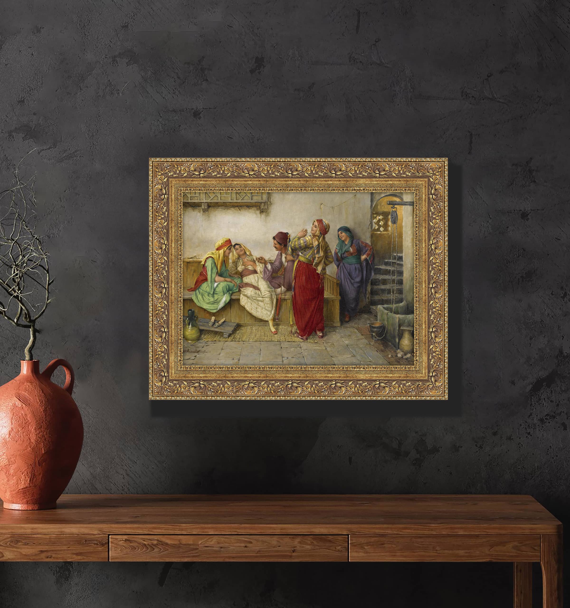 Bu tablo, geleneksel Osmanlı kıyafetleri giymiş kadınların gündelik yaşamını gösteren bir sahne sunuyor. Resimde, sedir üzerinde uzanmış bir kadın, etrafında ona eşlik eden diğer kadınlar ve bir adam yer alıyor. İç mekanın detayları, duvar dekorasyonları, taş zemin ve su kuyusu gibi unsurlar, dönemin mimarisini ve atmosferini yansıtmaktadır. Kompozisyon, figürlerin jest ve mimiklerinin yanı sıra kıyafetlerindeki detaylarla da dikkat çeker.
