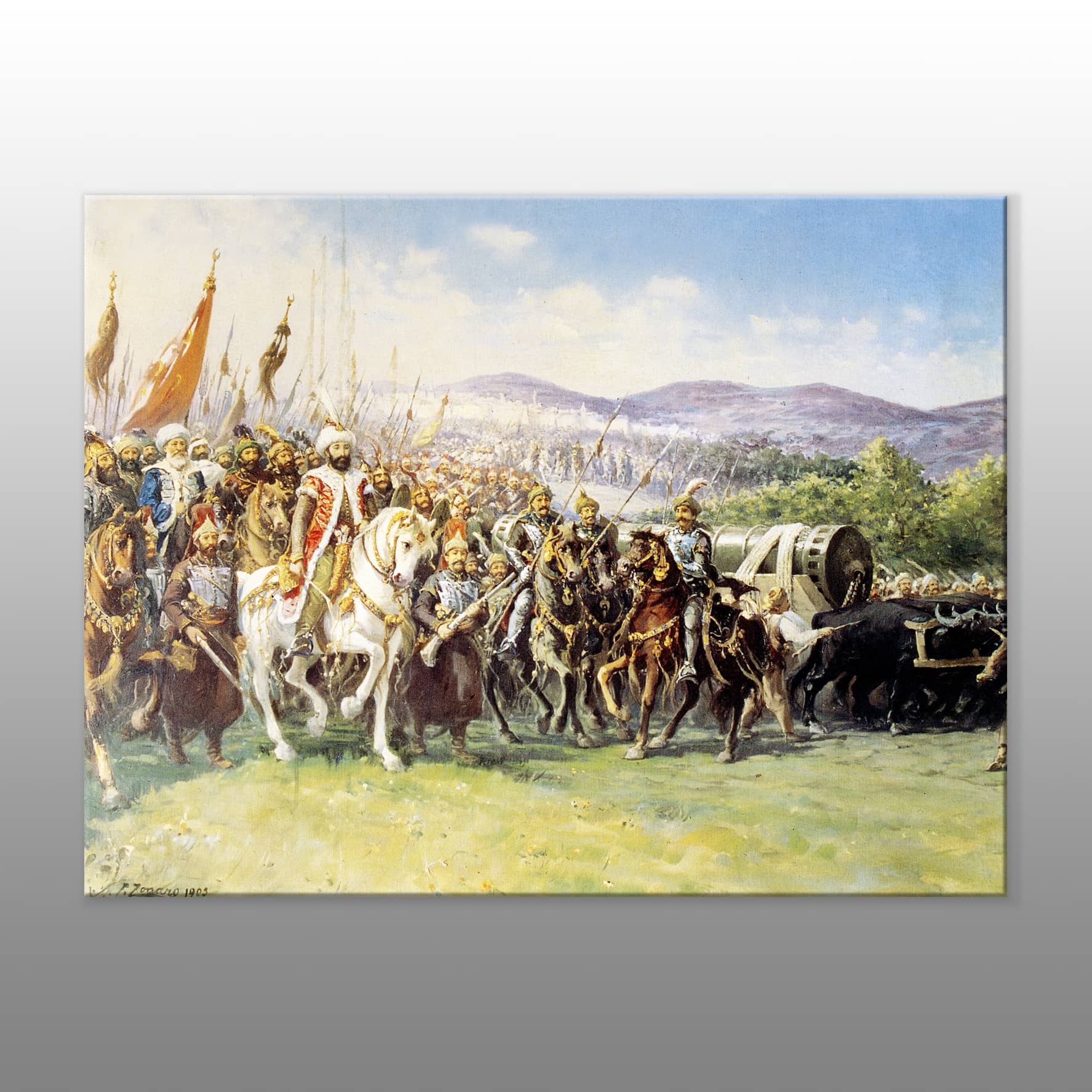 “Fautso Zonaro – Fatih Sultan Mehmet’in İstanbul’a Girişi” kanvas tablo, sadece bir dekorasyon ürünü değil, aynı zamanda büyük bir tarihi anın sanat yoluyla yeniden yaşanmasıdır. Galeri Gusto farkıyla evinizde veya çalışma alanınızda bu eşsiz eseri keşfedin, tarihin gücünü hissettirin!