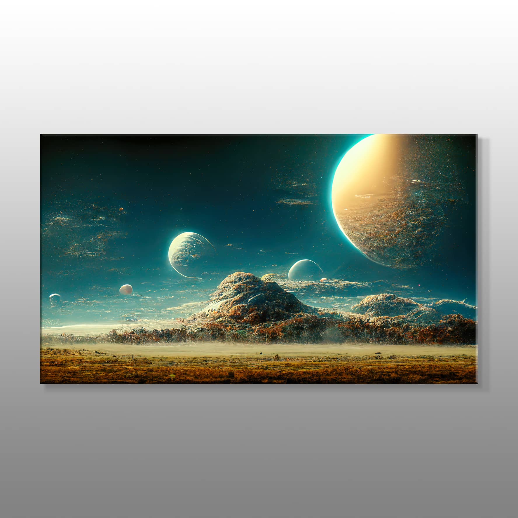 Gezegenler Altındaki Dağ Kanvas Baskı Tablo ürünü, doğanın gücü ile beraber evrenin büyüklüğünü aynı kare altında buluşturan sanat eserlerinden birisidir. Aynı zamanda bu tablo, izleyicilere dünyanın ve uzayın ihtişamını anlatan güçlü bir görsel sunuyor. Tabloda, yeryüzünde yükselen bir dağ silueti ile birlikte onun üzerinde parlayan gezegenler konumlanmış. Dağın heybeti ise doğanın ne kadar görkemli ve güçlü olduğunu vurgularken gezegenlerin varlığı, evrenin genişliği ile sonsuzluğunu simgeler. Gökyüzünde konumlanan gezegenler, farklı büyüklük ve renklerle temsil edilerek tablonun görsel derinliğini artırmayı başarıyor. Galeri Gusto’nun bu tablosu, izleyicilere uzayın büyüleyici gizemini hissettirirken daha kararlı ve sağlam duruşu temsil ediyor. Bu tablo, doğa ile uzayın buluştuğu bir sanat eserine sahip olmak isteyenler için mükemmel bir tercihtir.