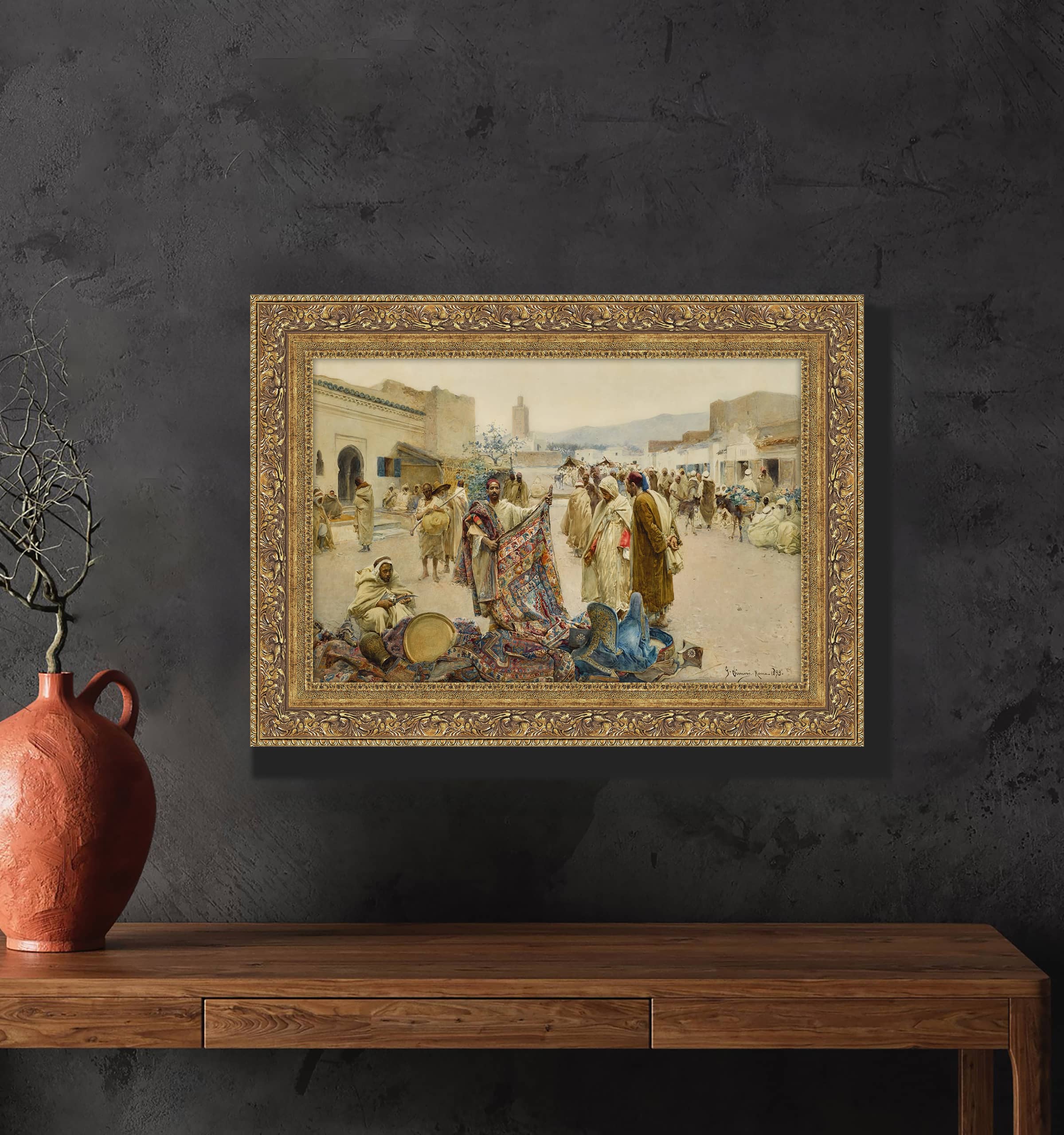 Bu eser, Giulio Rosati adlı İtalyan oryantalist ressam tarafından yapılmış bir tablo olabilir. Giulio Rosati, 19. yüzyılın sonlarında ve 20. yüzyılın başlarında, Kuzey Afrika ve Orta Doğu'nun pazar yerlerini ve gündelik yaşam sahnelerini resmetmesiyle tanınan bir sanatçıdır. Resimleri genellikle canlı renk paleti, detaylı kıyafet betimlemeleri ve dönemin sosyal atmosferini yansıtan sahnelerle dikkat çeker.
