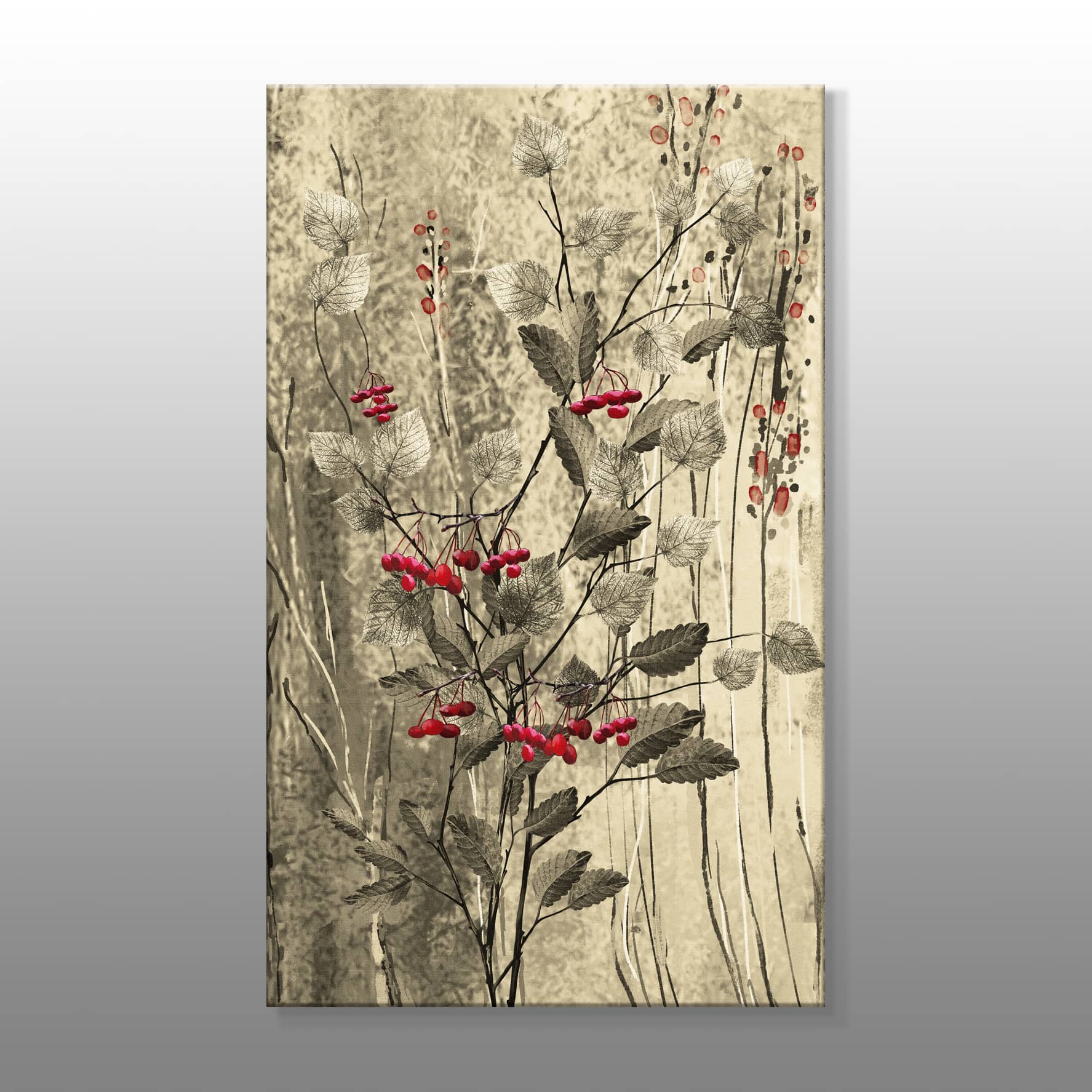 Gümüş Renkli Yapraklarr ve Kırmızı Çiçekler Kanvas Baskı Tablo