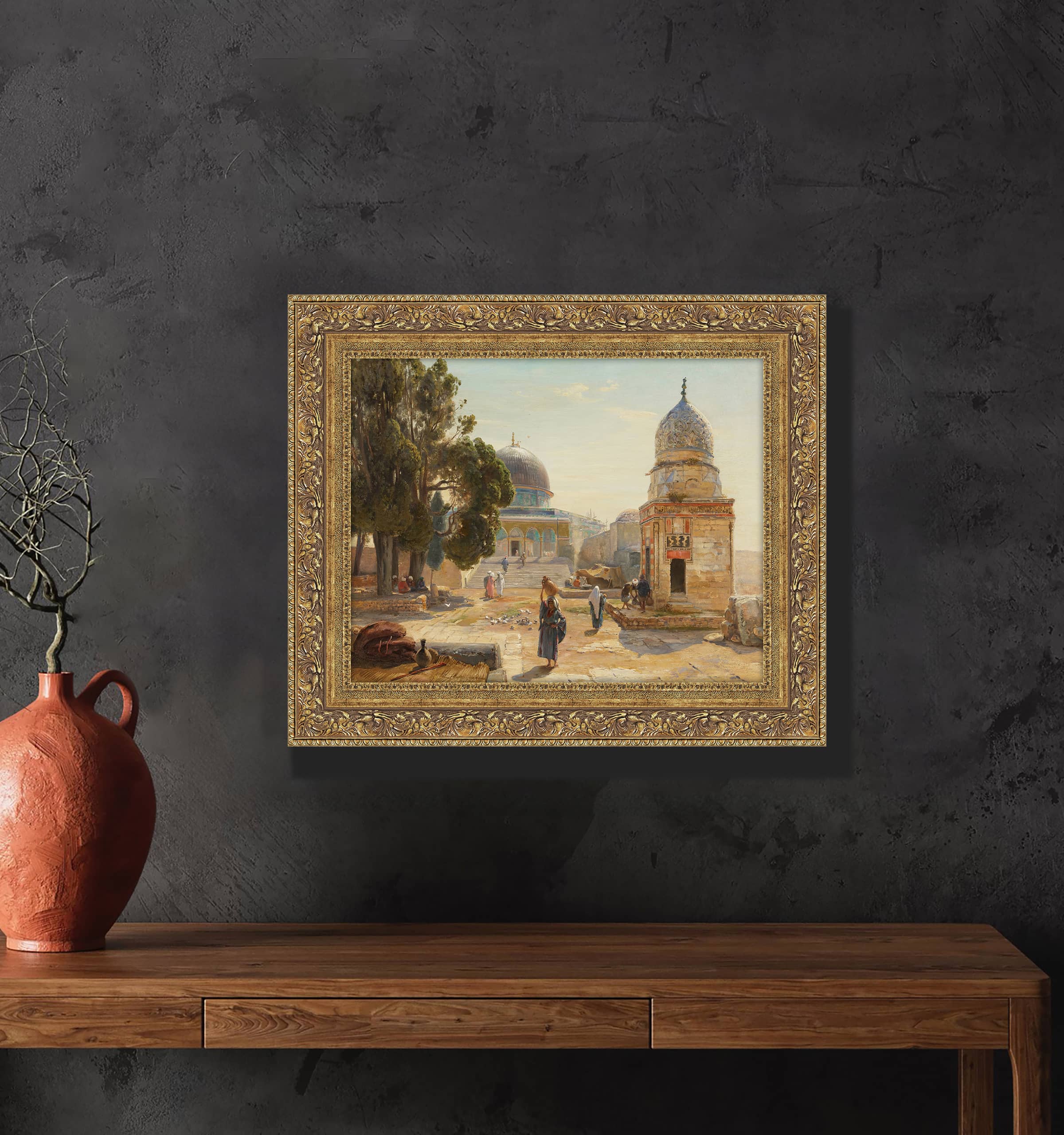 Bu tabloda, Kudüs'te bulunan Kubbet-üs-Sahra ve çevresindeki yapıların bir tasviri yer alıyor. Görüntüde, kubbeli yapılar, mimari detaylar, taş yollar ve etrafta dolaşan insanlar dikkat çekmektedir. İnsanların günlük yaşamlarını, dini aktivitelerini ve sosyal etkileşimlerini gösteren bu sahne, aynı zamanda bölgenin kültürel zenginliğini ve tarihi dokusunu da yansıtır. Işık kullanımı ve gölgeler, esere derinlik ve gerçeklik katmaktadır.