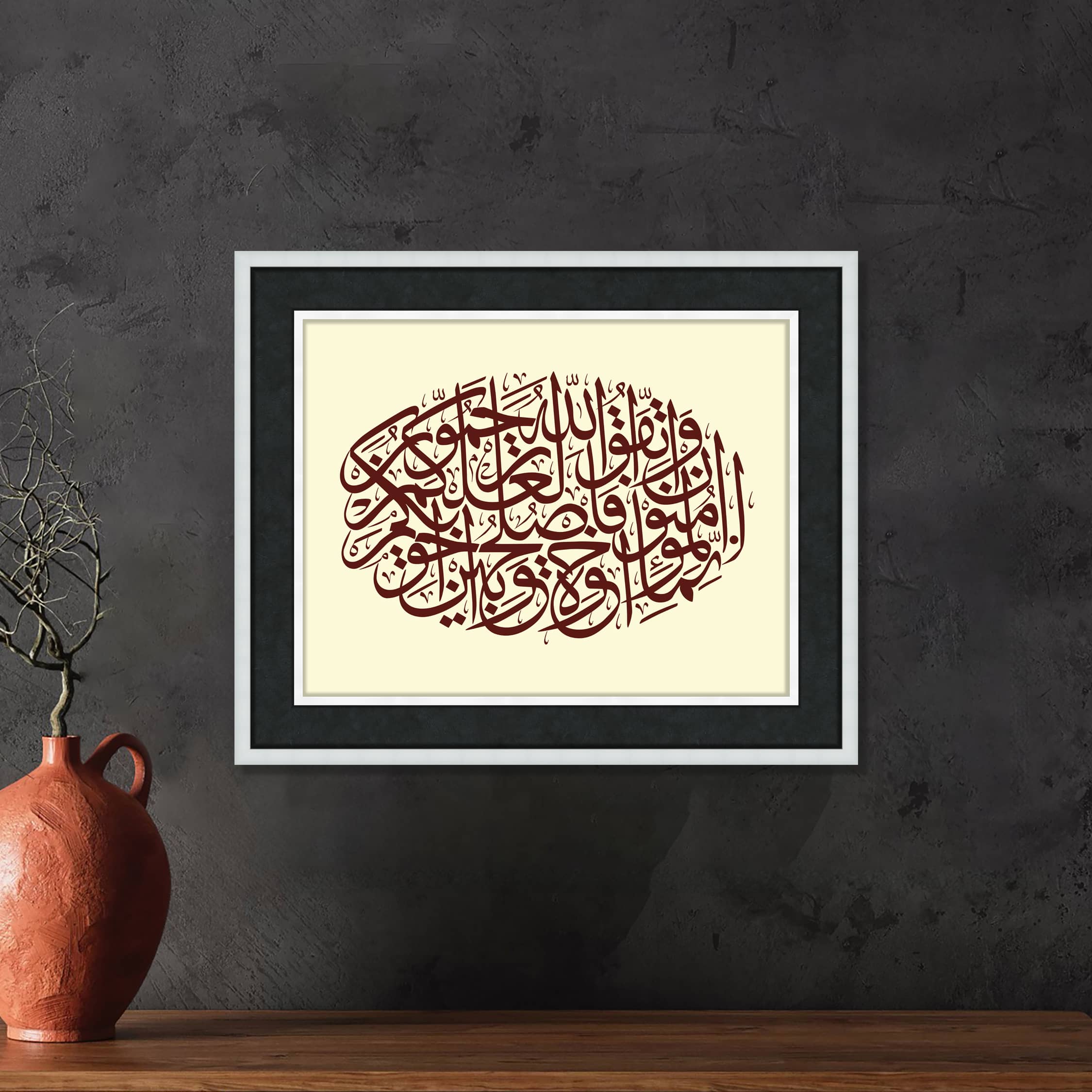 Türkçe Meali: "Müminler ancak kardeştirler. Öyleyse kardeşlerinizin arasını düzeltin ve Allah'tan korkun ki rahmete eresiniz." Ayetin Anlamı ve Açıklaması Kardeşlik Kavramı: Ayet, tüm müminlerin kardeş olduğunu vurgular. Bu, kan bağı dışında, inanç birliği temelinde bir kardeşliktir. İslam toplumunda, tüm müminler arasında sevgi, merhamet, adalet ve yardımlaşma esas olmalıdır. Barışı Sağlama ve Arayı Düzeltme: Ayet, müminler arasında meydana gelebilecek anlaşmazlıkları çözme ve barışı sağlama yükümlülüğünü hatırlatır. Müslümanlar, aralarındaki sorunları çözmek ve birlik içinde kalmak için çaba sarf etmelidir. Aralarındaki sorunların büyümemesi ve fitneye dönüşmemesi için barışı tesis etmek İslam'ın temel prensiplerindendir. Allah'tan Korkmak ve Takva: Ayet ayrıca Allah’tan korkup sakınmayı (takva) öğütler. Bu, Allah’ın emirlerine uygun bir şekilde hareket etmeyi ve Müslümanlar arasında adaleti ve huzuru sağlamayı içerir. Allah’tan korkarak, bu ilahi emre uymak, dünya ve ahiret saadetinin anahtarı olarak gösterilmiştir. Rahmete Erişmek: Ayetin son kısmı, Allah’ın rahmetine nail olmanın, müminlerin birbirleriyle iyi geçinmelerine, aralarındaki sorunları çözmelerine ve Allah’tan korkarak yaşantılarını sürdürmelerine bağlı olduğunu ifade eder. Rahmet, sadece dünya hayatında huzur değil, ahiret saadeti için de bir anahtardır. Ayetin Önemi ve Toplumsal Mesajı Toplumda Barış ve Huzurun Temeli: Bu ayet, İslam toplumlarının temelini oluşturan kardeşlik, birlik ve beraberlik kavramlarını vurgular. Müminler arasındaki anlaşmazlıklar, fitne ve bölünmelere yol açmadan çözülmeli, barış ve huzur sağlanmalıdır. Müslümanların Birbirine Karşı Sorumluluğu: Bu ayet, her Müslümanın diğer müminlerin iyiliği ve esenliği için sorumluluk taşıdığını hatırlatır. Herhangi bir tartışma veya anlaşmazlık durumunda arabuluculuk yapmak ve barışı sağlamak, her Müslümanın görevidir. İslam Ahlakının Temel İlkeleri: Hucurat Suresi 10. Ayet, İslam ahlakının temel ilkelerini hatırlatır: kardeşlik, adalet, merhamet, takva ve Allah'a karşı sorumluluk bilinci. Sonuç Hucurat Suresi 10. Ayet, Müslümanlar arasındaki kardeşlik bağlarının ne kadar güçlü olması gerektiğini ve barışı sağlamanın önemini vurgulayan önemli bir ayettir. İslam toplumunda birliğin, beraberliğin ve huzurun sağlanması için Müslümanların birbirine karşı sorumluluklarının ve Allah'a olan takvalarının farkında olmaları gerektiğini hatırlatır. Çerçeve , Lamine Çerçeveden üretilmiştir. Çift katmanlı çerçeve kırık beyaz renginde, derinlikli çeçreve kullanılmıştır, Baskı, Hahnemühle, Stüdio Enhenced 190 gr /m² Kağıt Kullanılmıştır. Paspartu; 6 cm Siyah İthal 17 micron kağıt kullanılmıştır. Cam, 2 mm Normal Cam Kullanılmıştır.