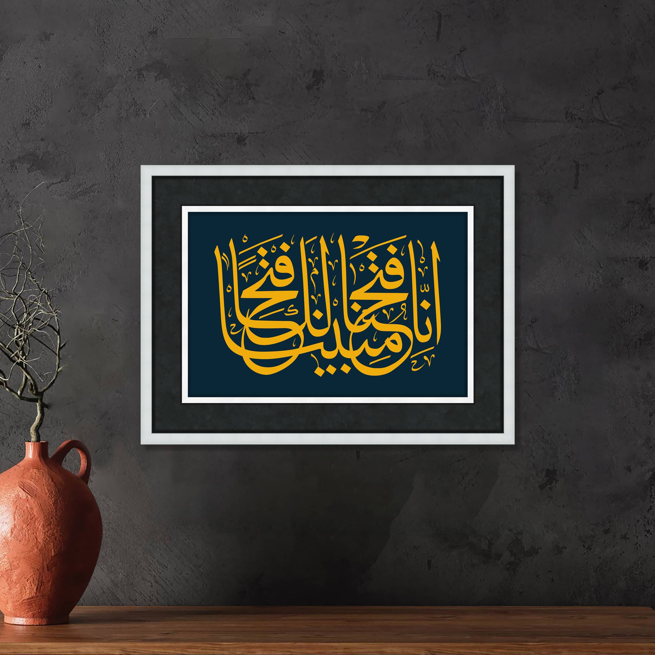 "İnna fetahna leke fethan mubina" ifadesi, Kur'an-ı Kerim'de Fetih Suresi'nin 1. ayetinde yer almaktadır. Bu ayet, İslam tarihinde önemli bir olay olan Hudeybiye Antlaşması'ndan sonra nazil olmuştur ve bu olayın önemini vurgular. Ayetin anlamı, Allah'ın Hz. Muhammed'e (s.a.v.) büyük ve açık bir zafer verdiğini ifade eder. Anlamı ve Açıklaması: "İnna" (إِنَّا): "Biz" anlamına gelir ve Allah’ın kudret ve büyüklüğünü vurgulamak için kullanılır. "Fetahna" (فَتَحْنَا): "Açtık, fethettik" anlamına gelir. Burada "fetih", zafer anlamında kullanılır ve sadece askeri bir zaferi değil, aynı zamanda kalplerde, zihinlerde ve dinin yayılmasında gerçekleşen manevi bir açılımı da ifade eder. "Leke" (لَكَ): "Senin için, sana" demektir. Burada Hz. Muhammed'e (s.a.v.) hitap edilir ve ona verilen ilahi bir müjdeye işaret edilir. "Fethan Mubina" (فَتْحًا مُّبِينًا): "Apaçık bir fetih, parlak bir zafer" anlamına gelir. "Mubin", açık ve net olan demektir. Bu ifade, Hudeybiye Antlaşması ile kazanılan barış ve İslam'ın yayılması için oluşturulan yeni fırsatları tanımlar. Ayetin Tarihi Bağlamı: Hudeybiye Antlaşması: Bu ayet, Hudeybiye Antlaşması'nın ardından nazil olmuştur. Bu antlaşma, Müslümanlarla Mekke müşrikleri arasında yapılmış ve başlangıçta Müslümanların aleyhine gibi görünse de, aslında İslam’ın büyümesi ve yayılması için önemli bir dönüm noktası olmuştur. Bu anlaşma, Mekke’nin fethine giden yolu açmış ve İslam'ın daha da güçlenmesine vesile olmuştur. Manevi ve Siyasi Zafer: "Fethan Mubina" ifadesi, sadece askeri bir zaferi değil, aynı zamanda büyük bir manevi zaferi ve İslam'ın genişlemesini ifade eder. Hudeybiye Antlaşması'ndan sonra, İslam hızla yayıldı ve Müslümanların sayısı arttı. Sonuç: "İnna fetahna leke fethan mubina" ayeti, İslam tarihinde önemli bir dönüm noktasını simgeler. Bu ayet, Allah'ın Hz. Muhammed'e (s.a.v.) ve Müslümanlara sunduğu büyük bir zaferi ve başarıyı müjdelemektedir. Müslümanlar için bu ayet, Allah’ın yardımının ve zaferinin her zaman Müslümanların yanında olacağına dair bir güven ve inanç kaynağıdır. Çerçeve , Lamine Çerçeveden üretilmiştir. Çift katmanlı çerçeve kırık beyaz renginde, derinlikli çeçreve kullanılmıştır, Baskı, Hahnemühle, Stüdio Enhenced 190 gr /m² Kağıt Kullanılmıştır. Paspartu; 6 cm Siyah İthal 17 micron kağıt kullanılmıştır. Cam, 2 mm Normal Cam Kullanılmıştır.