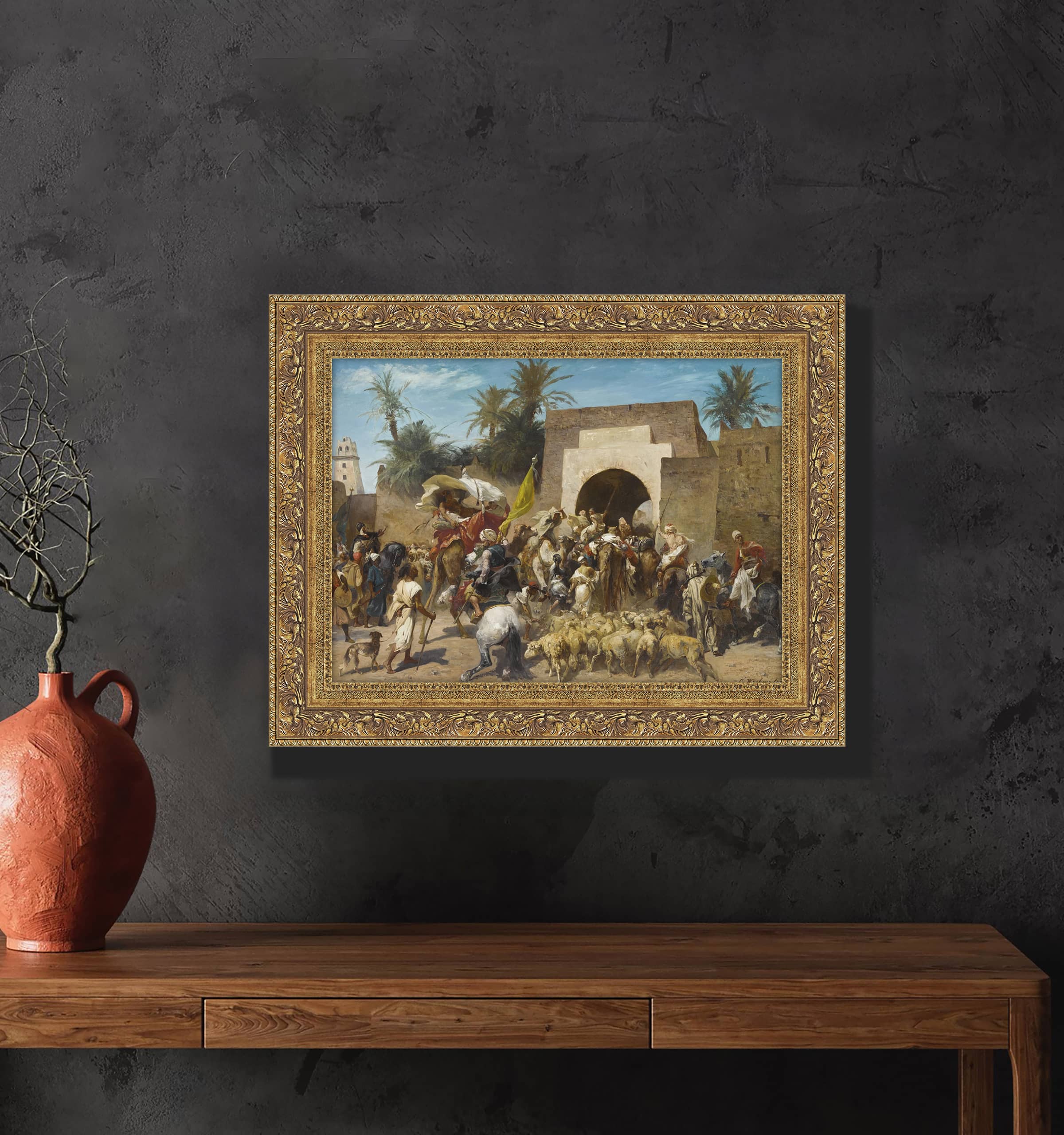 Bu resim, bir şehir kapısında toplanan kalabalık bir grup insan ve hayvanı tasvir ediyor. Görüntüde, at sırtında olan ve sancak taşıyan figürler, deve ve koyun sürüsüyle birlikte hareket eden insanlar yer alıyor. Sahne, bir geçit töreni veya pazar yeri atmosferi sunarak hareketli ve dinamik bir ortamı betimliyor. Resmin arka planında görülen palmiyeler ve mimari yapı, sahnenin muhtemelen Kuzey Afrika'da bir yer olduğunu gösteriyor.