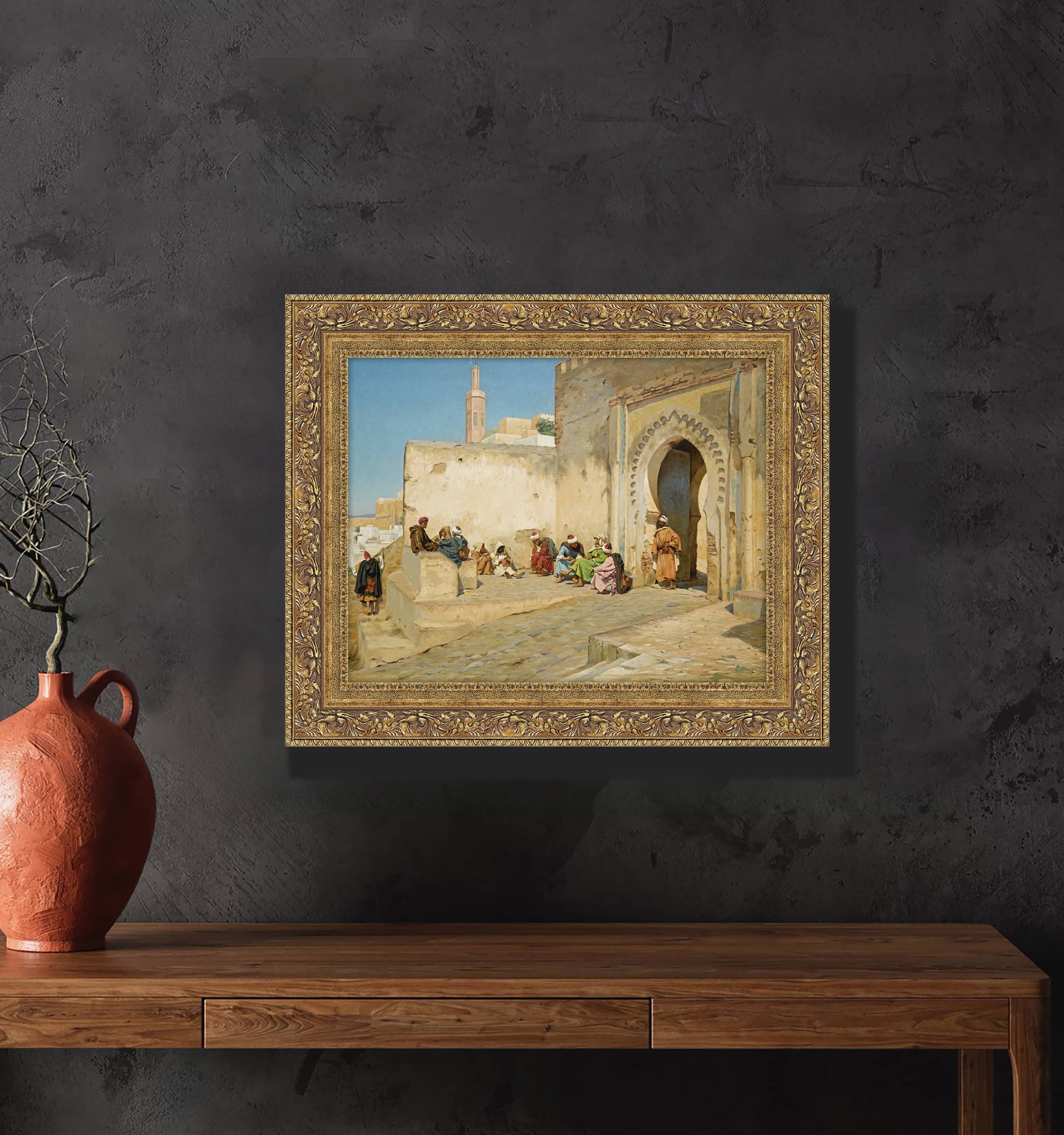 Bu tabloda, bir Kuzey Afrika veya Orta Doğu kasabasında gündelik yaşamdan bir sahne betimlenmiştir. Görüntüde, geleneksel kıyafetler giymiş bir grup insan, bir yapının kemerli kapısının önünde oturmuş ve sohbet ederken görülmektedir. Mekanın atmosferi, mimari detaylar, özellikle kemerli giriş ve arka planda görülen minare, sahnenin coğrafi ve kültürel bağlamını güçlendirmektedir. Tablodaki ışık kullanımı, figürlerin yerleşimi ve mekanın derinliği, sahnenin gerçekçiliğini ve etkileyiciliğini artırır.