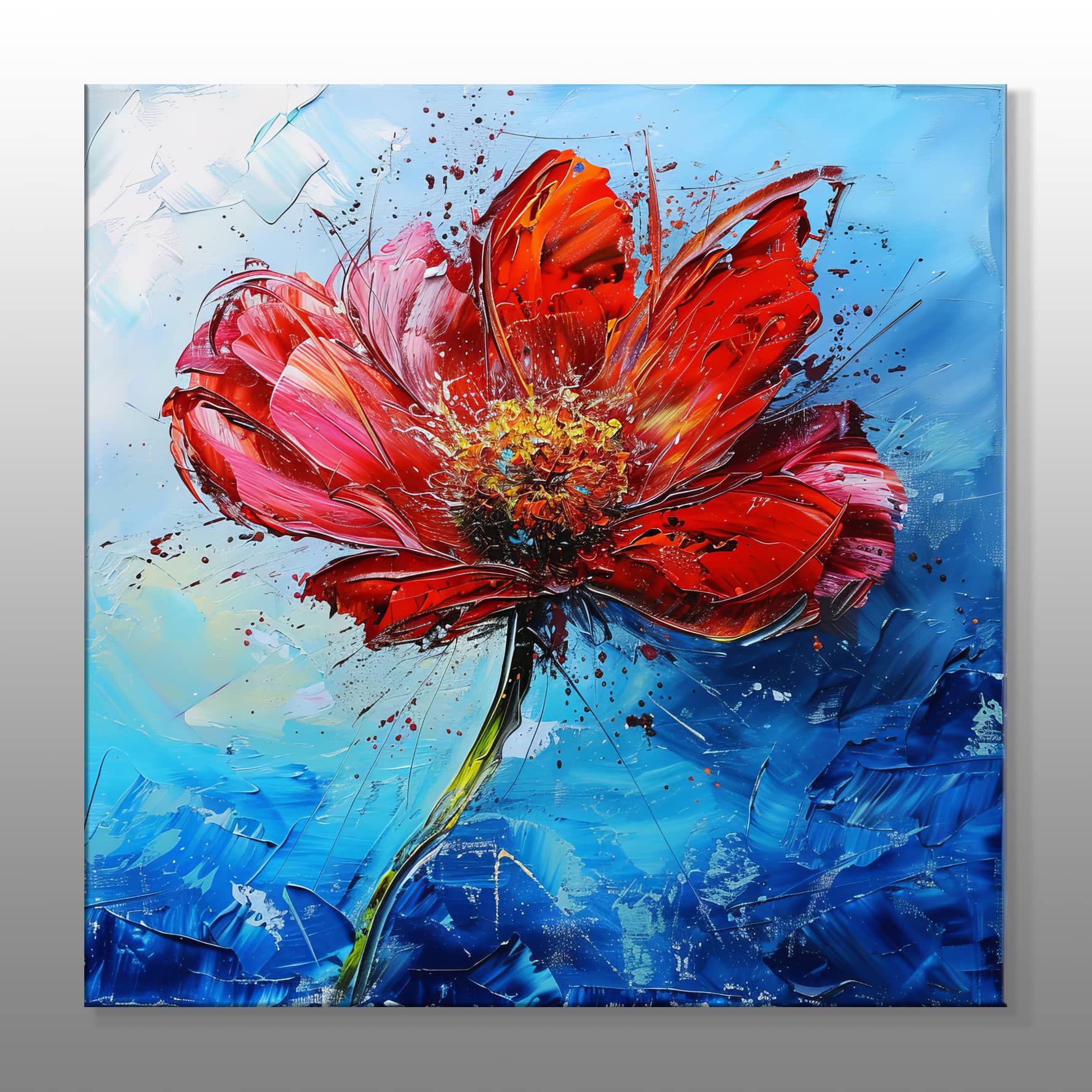 Canlı kırmızı tonlarıyla betimlenmiş çiçek motifi, enerjiyi ve tutkuyu simgelerken, arka plandaki mavi tonlar tabloya derinlik ve huzur katıyor. Kalın fırça darbeleriyle yaratılmış dokular ve dikkat çekici renk geçişleri sayesinde, bu tablo yalnızca görsel bir şölen değil; aynı zamanda duygusal bir anlatı sunuyor.