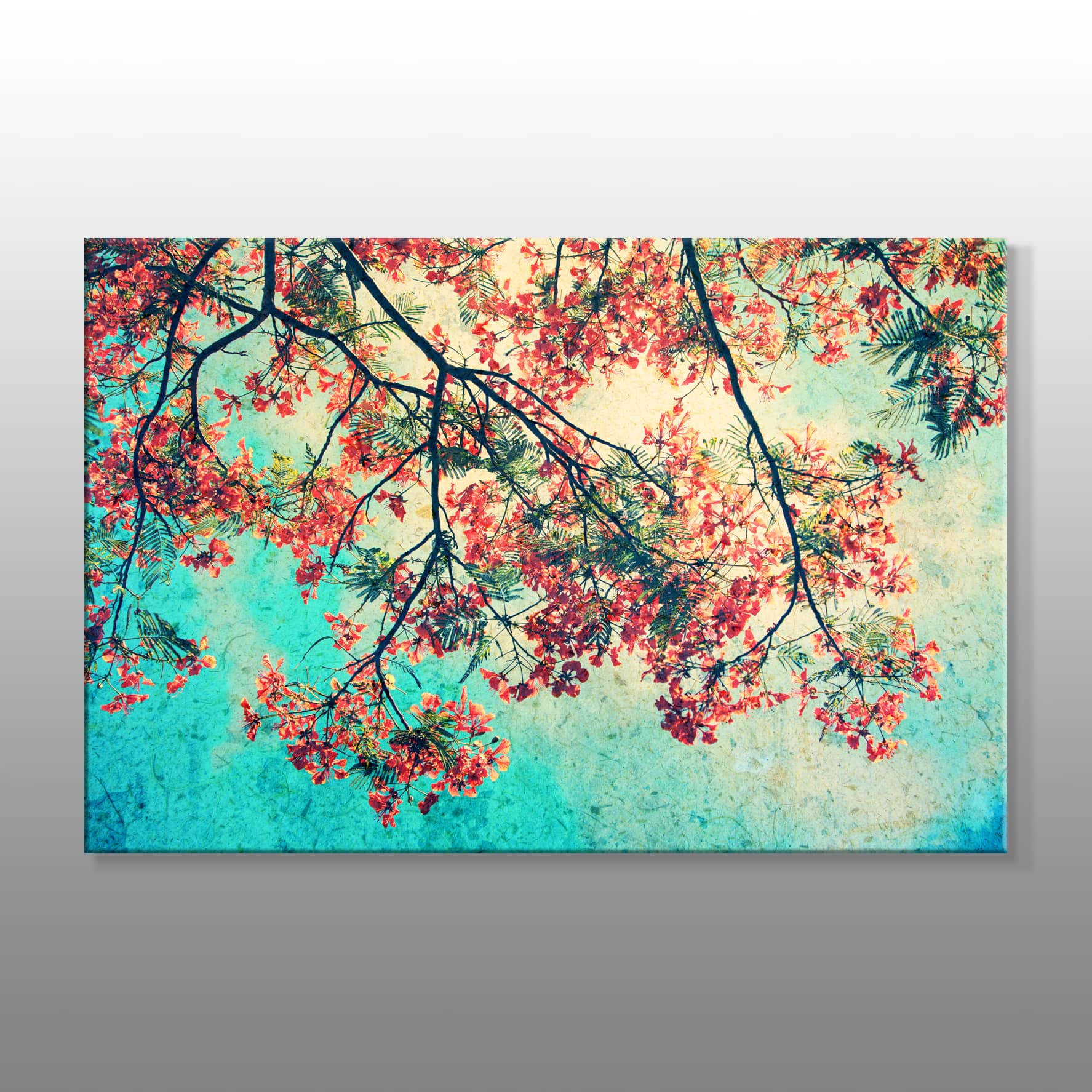 Kırmızı Çiçekler Ve Turkuaz Gökyüzü Kanvas Baskı Tablo