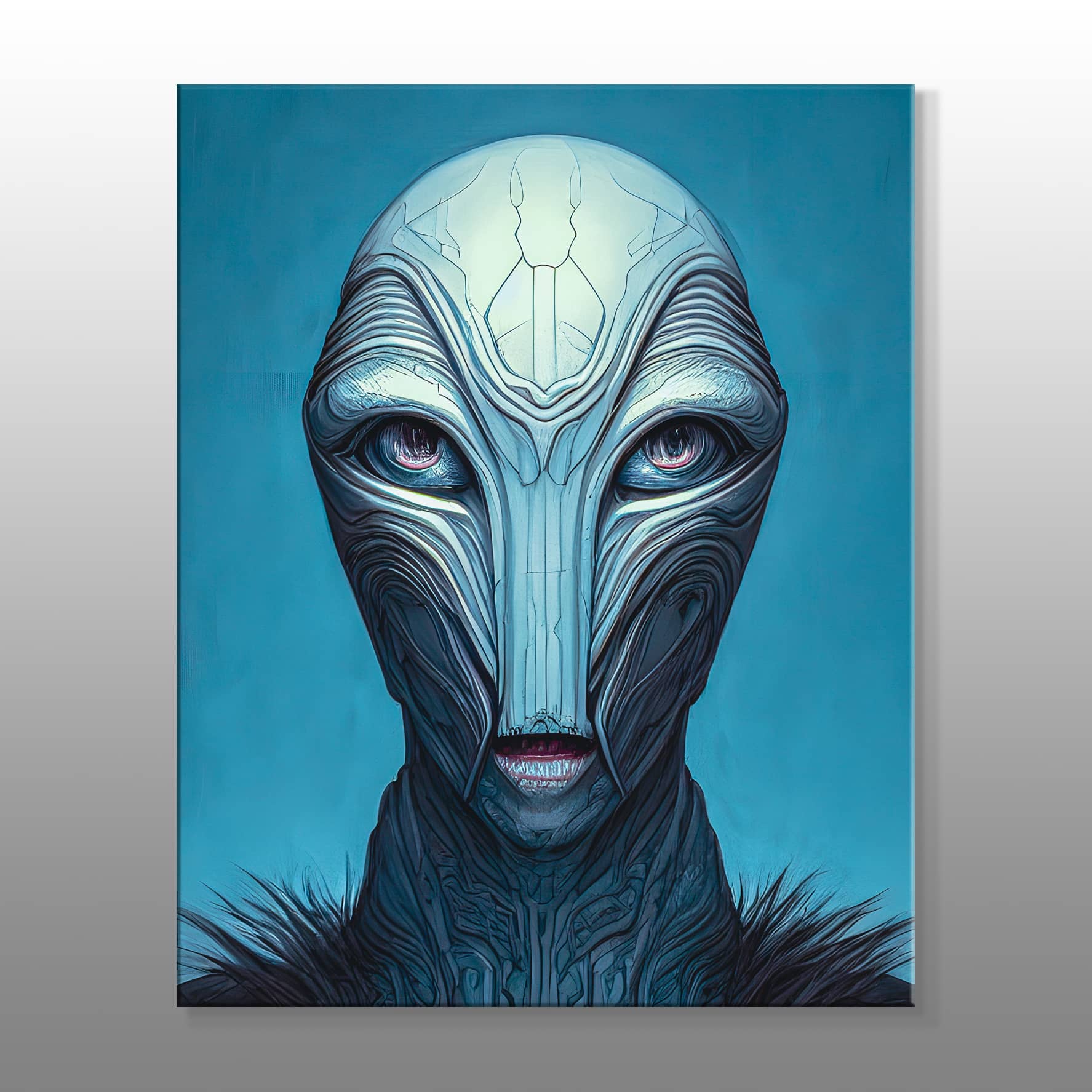 Mavi Maskeli Uzaylı Elçi Kanvas Baskı Tablo modeli, fantastik ve bilim kurgu unsurlarını şık bir şekilde bir araya getirerek etkileyici bir sanat eseridir. Tablo, mavi renk tonlarının bir maskeye sahip olan uzaylı elçinin gizemli ve büyüleyici bir portresini sunar. Uzaylı figürünün detaylı maskesi ise mistik ve modern bir hava katarak izleyiciyi uzak galaksilere ve bilinmeyen dünyalara doğru bir yolculuğa çıkarır. Arka planda kullanılan derin mavi tonlar, uzay atmosferini ve bilinmeyen evrenin ihtişamını yansıtmaktadır. Uzaylı elçinin etkileyici ve sakin duruşu, tabloya hem sakinlik hem de güçlü bir karakter kazandırmaktadır. Galeri Gusto’nun bu yaratıcı ve sıra dışı tasarımı, bilim kurgu meraklıları ile fantastik temalarla ilgilenenler için mükemmel bir dekoratif seçimdir.