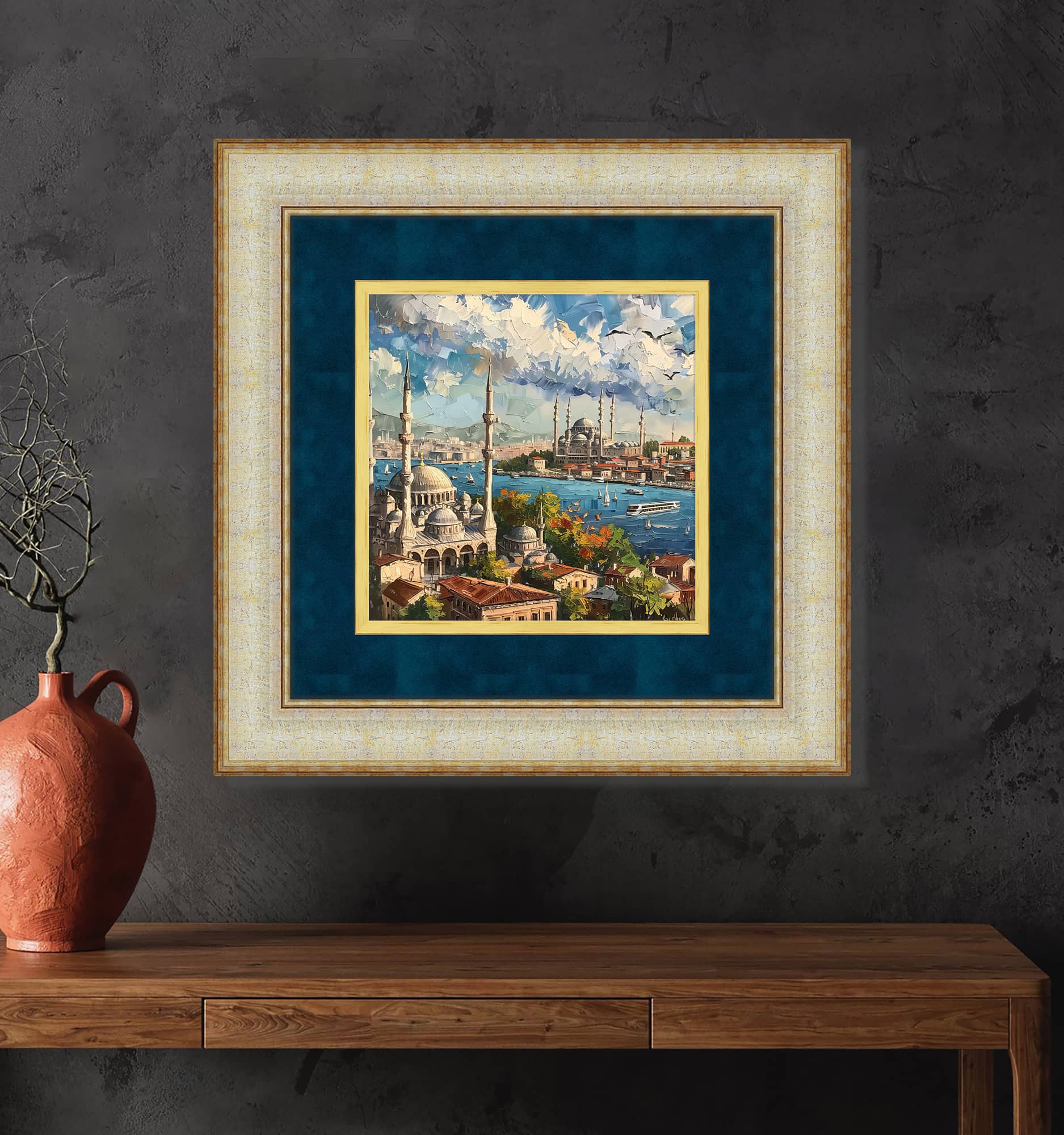 Minarelerin Gölgesi Tablo, İstanbul'un tarihi siluetine ve mistik atmosferine dair büyüleyici bir yansıma sunuyor. Bu eser, minarelerin ihtişamlı gölgeleriyle çevrili bir şehri tasvir ederek, modern yaşam alanlarına geçmişin derin izlerini taşır. Minarelerin zarif yapıları, gökyüzüyle birleşirken, yansıyan ışık ve gölge oyunlarıyla adeta bir görsel şölen oluşturur. Tablonun tasarımı, şehri simgeleyen minareler, camiler ve tarihi yapıları, zarif hatlarla birleştirerek İstanbul’un derin tarihini ve kültürünü çağdaş bir estetikle sunar. Minarelerin Gölgesi tablosu hem tarihi hem de modern öğeleri bir arada barındırarak, izleyicilere hem görsel hem de duygusal bir deneyim sunar. Evinizde, ofisinizde ya da diğer yaşam alanlarınızda yer verebileceğiniz Minarelerin Gölgesi tablosu, Galeri Gusto’nun zarif ve özgün tasarımları arasında sizlere sunuluyor. Hem sanatı hem de şehri seviyorsanız, bu tablo tam size göre.
