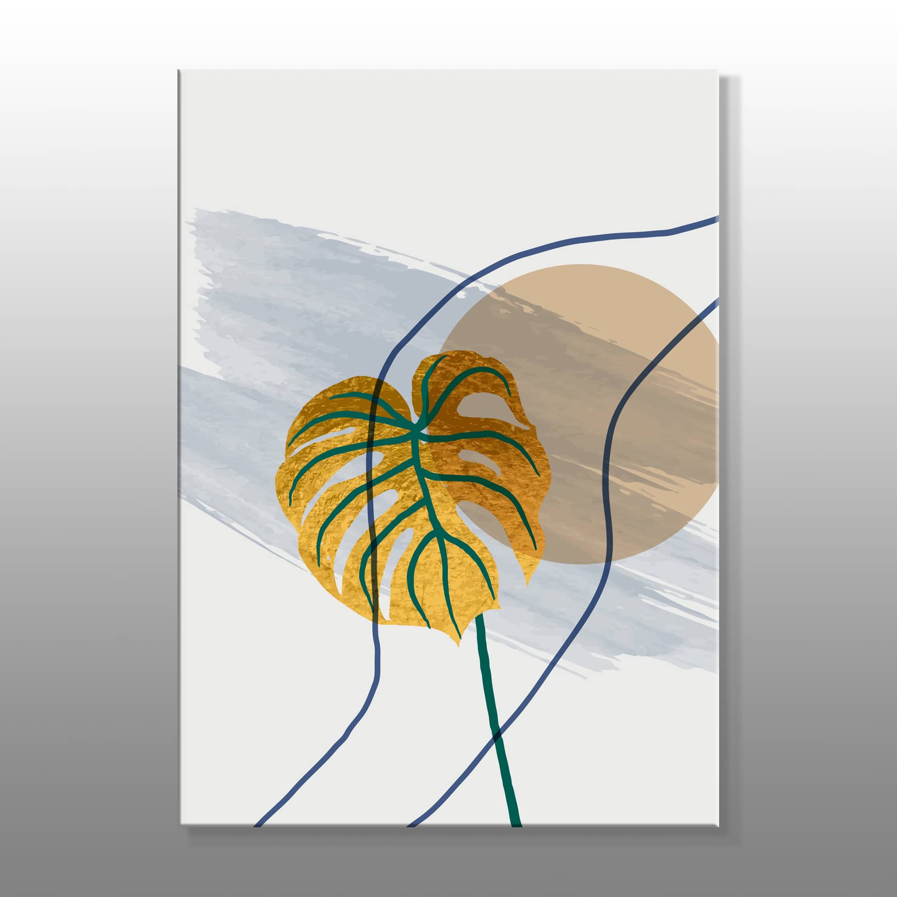 Minimal Altın Renkli Yeşil Detaylı Yaprak Çizimi Kanvas Baskı Tablo