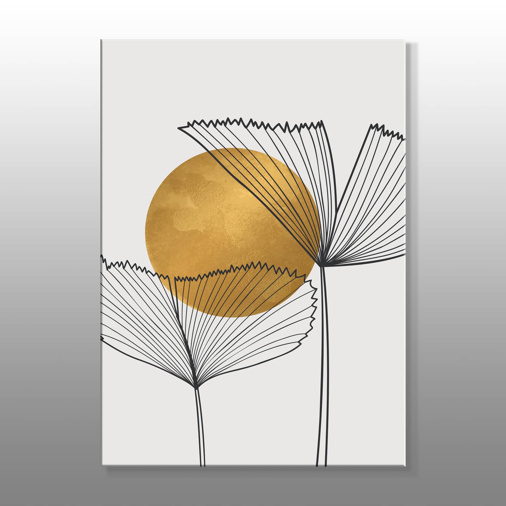 Minimal Yaprakların Arkasındaki Altın Güneş Kanvas Baskı Tablo