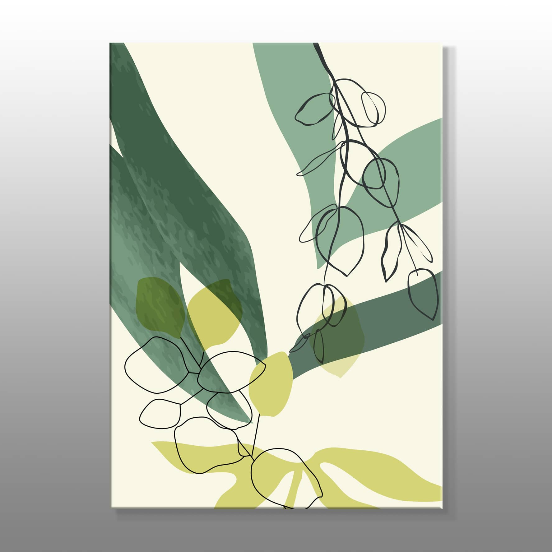 Minimal Yeşil Tonlu Bitkilerin Önündeki Siyah Çizgiyle Çizilmiş Bitkiler Kanvas Baskı Tablo