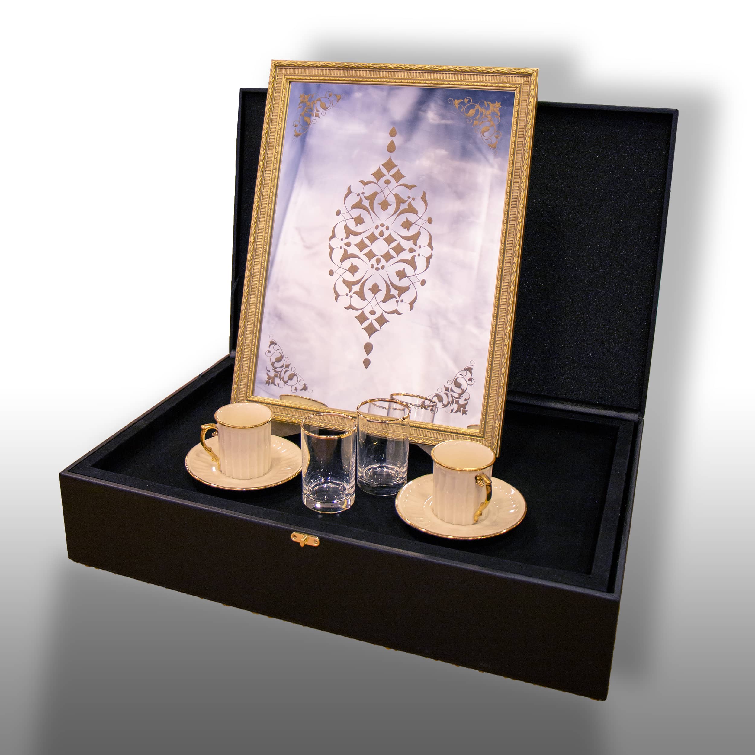 Bu şık ve zarif kahve fincanı seti, evinizin her köşesinde benzersiz bir atmosfer yaratmak için tasarlanmıştır. Set, iki adet porselen kahve fincanı, iki adet altın şerit detaylı su bardağı ve ince işçilikle hazırlanmış dekoratif bir çerçeveli tablodan oluşmaktadır. Tüm parçalar, kaliteli malzemelerden üretilmiş olup, uzun yıllar kullanım için uygundur.