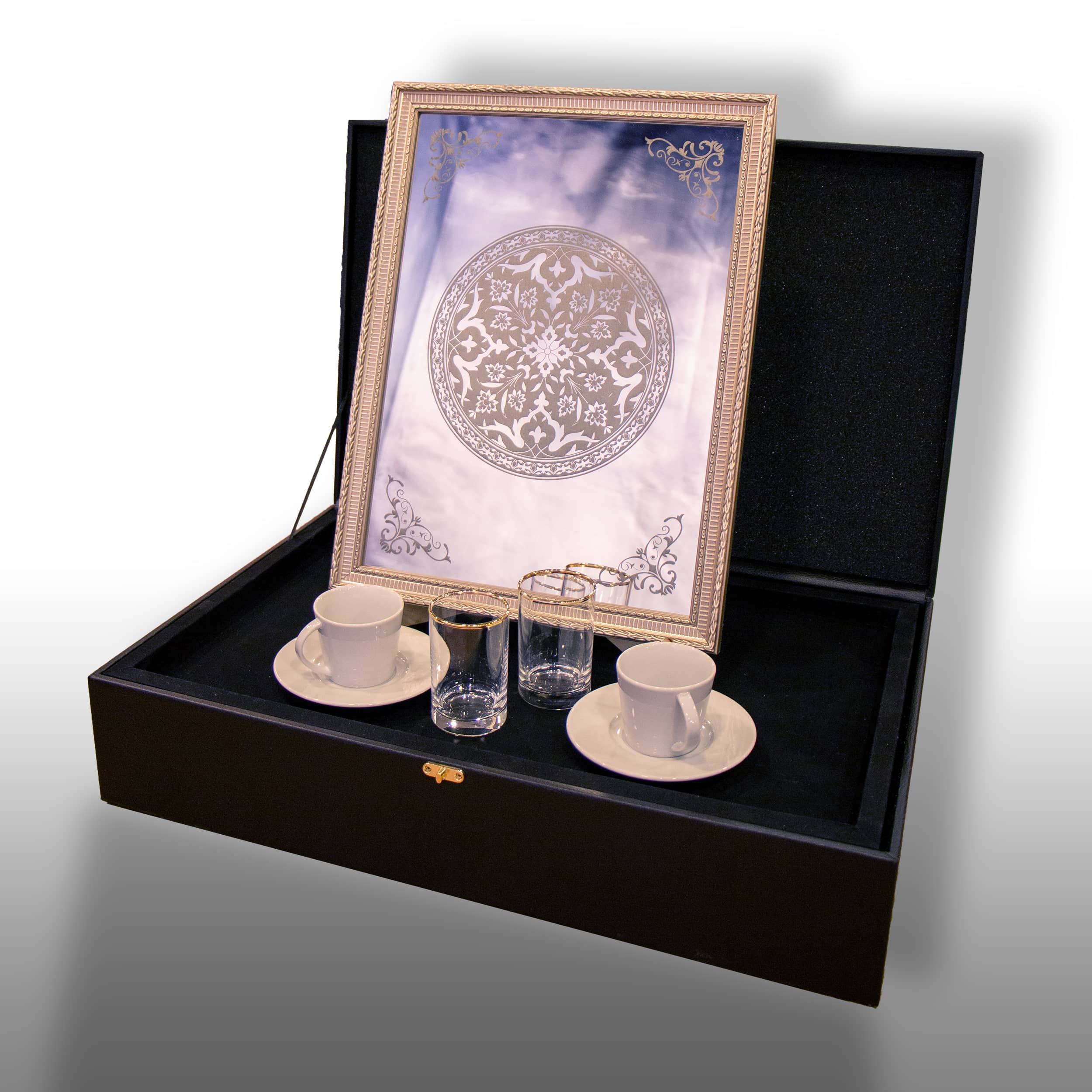 Bu şık ve zarif kahve fincanı seti, evinizin her köşesinde benzersiz bir atmosfer yaratmak için tasarlanmıştır. Set, iki adet porselen kahve fincanı, iki adet altın şerit detaylı su bardağı ve ince işçilikle hazırlanmış dekoratif bir çerçeveli tablodan oluşmaktadır. Tüm parçalar, kaliteli malzemelerden üretilmiş olup, uzun yıllar kullanım için uygundur.