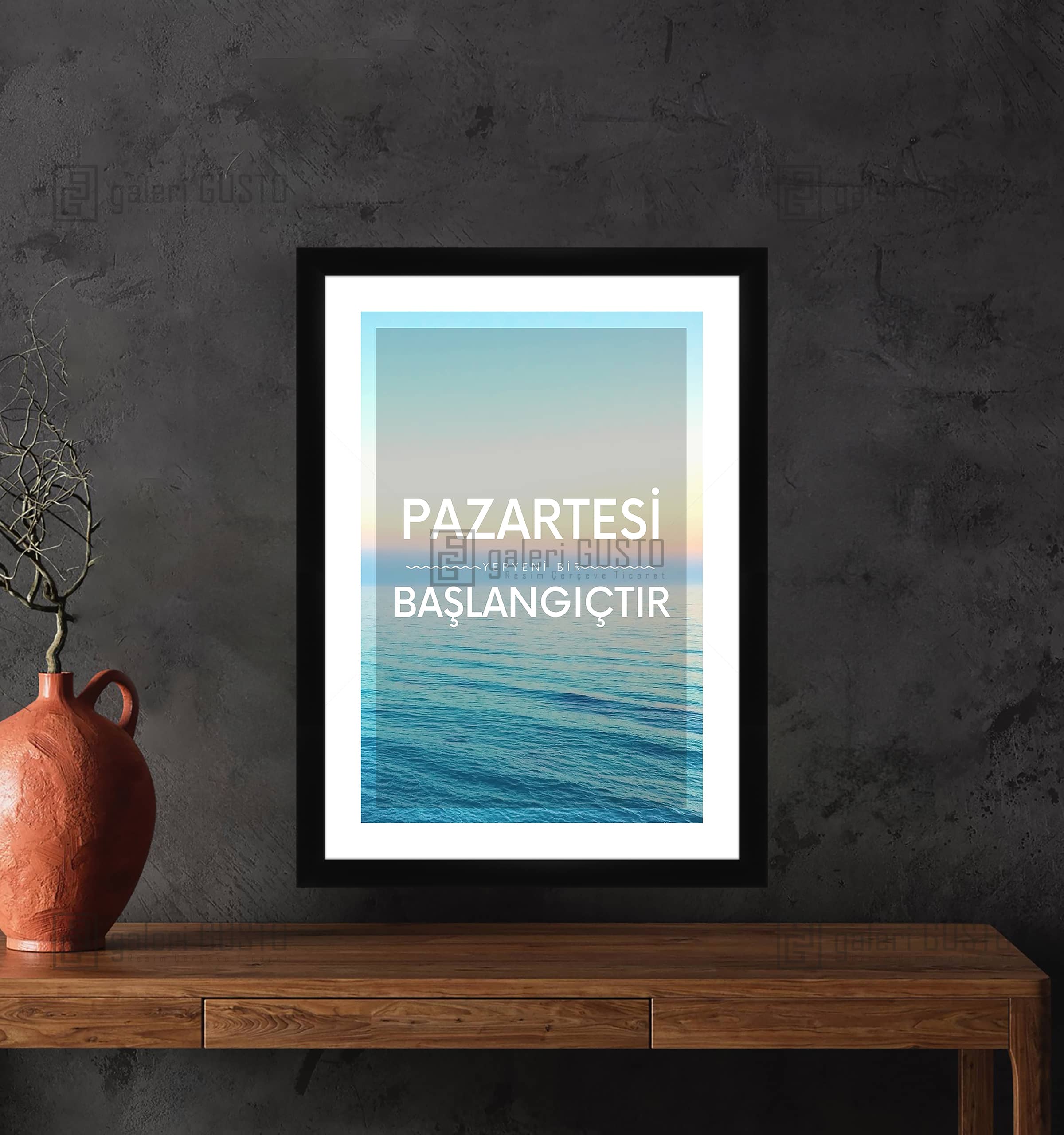Pazartesi Başlangıçtır Çerçeveli Poster, haftanın ilk günü olan Pazartesi’yi bir motivasyon kaynağına dönüştüren enerjik ve pozitif bir tasarıma sahip. Bu çerçeveli poster, yaşam alanlarınıza taze bir başlangıç hissi katarak, her yeni haftanın bir fırsat olduğunu hatırlatır. Poster, modern tipografi ve şık bir tasarımla "Pazartesi Başlangıçtır" mesajını vurgular. Sade ve etkileyici bir estetikle tasarlanmış olan bu poster, ofislerde, çalışma alanlarında veya evinize pozitif bir atmosfer katmak için mükemmeldir. Bu çerçeveli poster, size ve sevdiklerinize her hafta başladığınızda yeniliklere ve fırsatlara odaklanmayı hatırlatırken, aynı zamanda bulunduğunuz ortamda şıklık ve ilham verir. Galeri Gusto’nun zarif çerçeveli poster koleksiyonunda, Pazartesi Başlangıçtır gibi ilham verici eserler hem dekoratif hem de motive edici bir öğe olarak öne çıkmaktadır.
