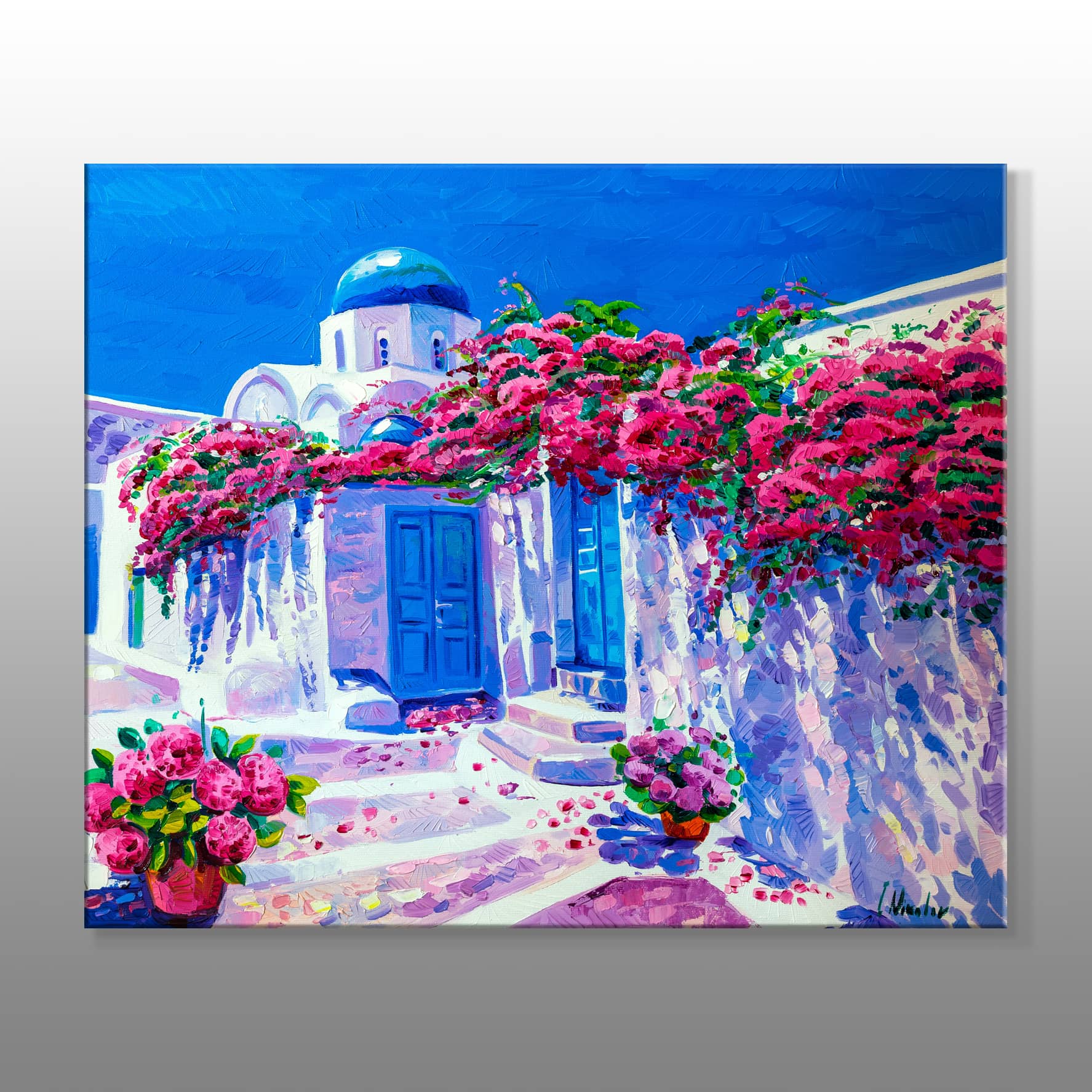 Pembe Çiçekli Ege Evi Kanvas Baskı Tablo