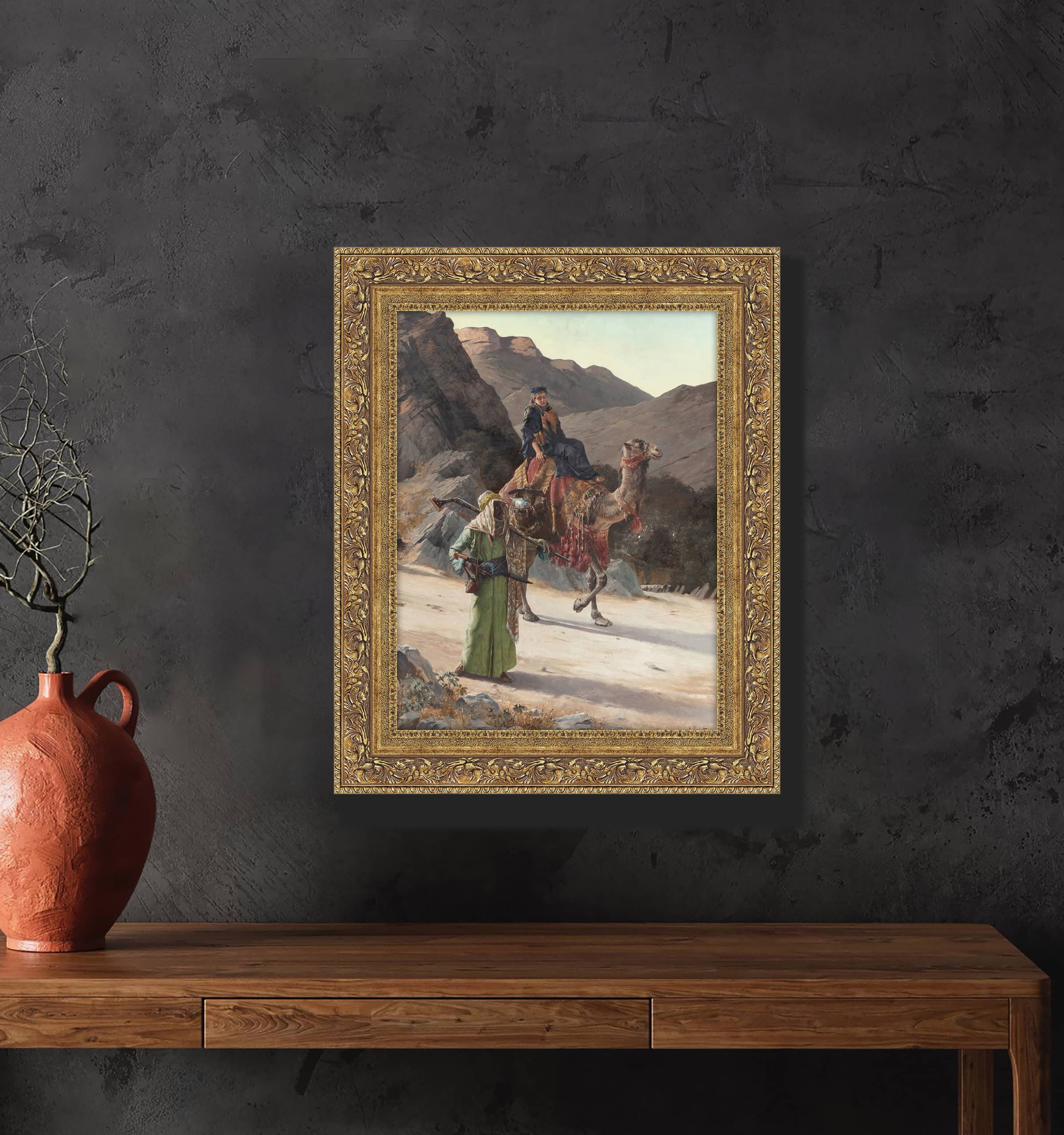 Bu tablo, çöl benzeri bir ortamda deve sırtında bir gezgin ve onu yönlendiren bir rehberi veya korumayı betimliyor. Görüntüde, geleneksel kıyafetler giymiş iki figür ve süslemeli bir deve, sahnenin odak noktalarını oluşturuyor. Önde yürüyen figür, bir tüfek taşırken, arkadaki figür deve üzerinde oturmuş ve dağlık bir yolculuğun ortasındaymış gibi görünmektedir. Arka plan ise kayalık dağlar ve kuru bir doğa ile detaylandırılmıştır, bu da tabloya derinlik katmaktadır.
