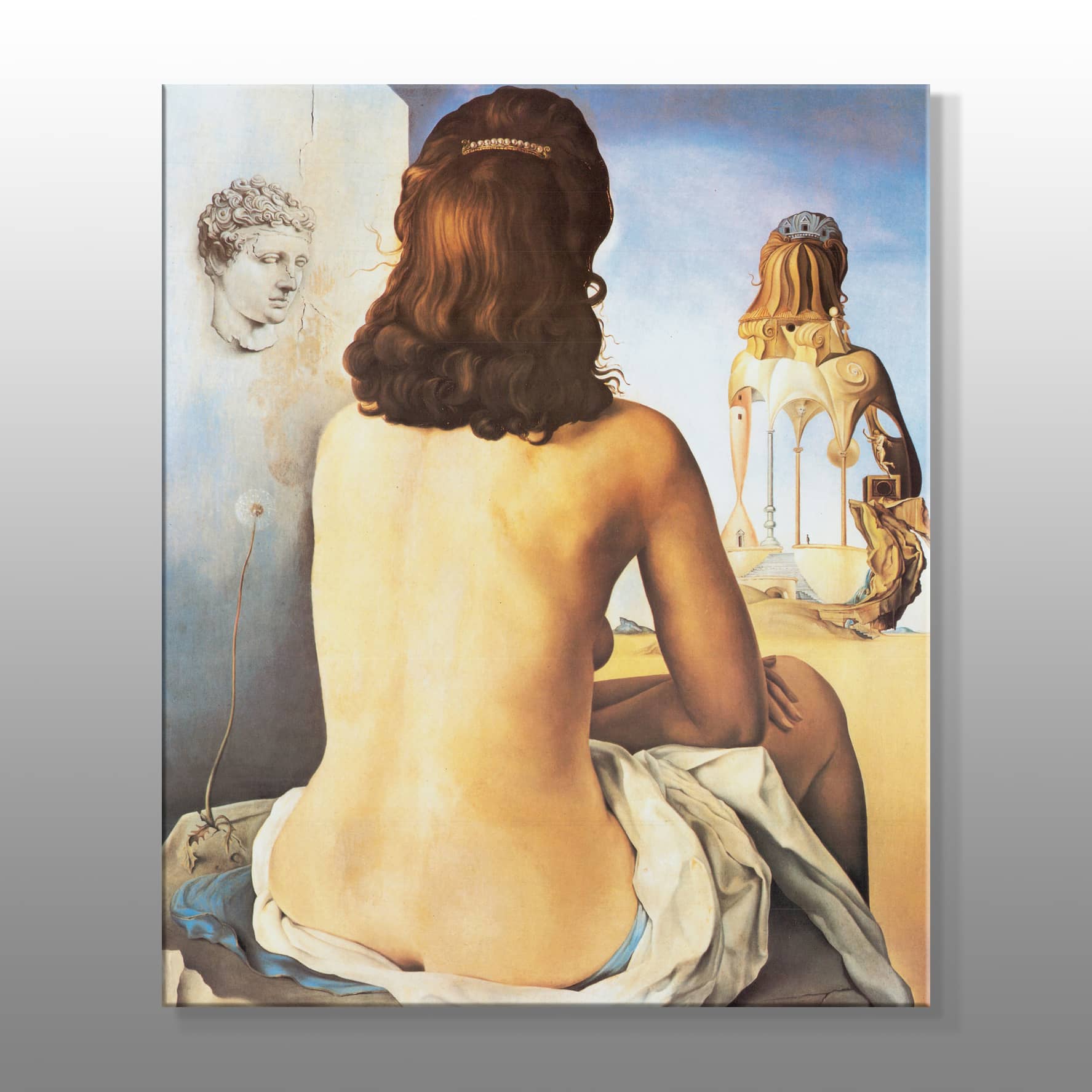 Salvador Dali My Wife, Nude, Contemplating Her Own Flesh Becoming Stairs, Three Vertebrae of a Column, Sky and Architecture