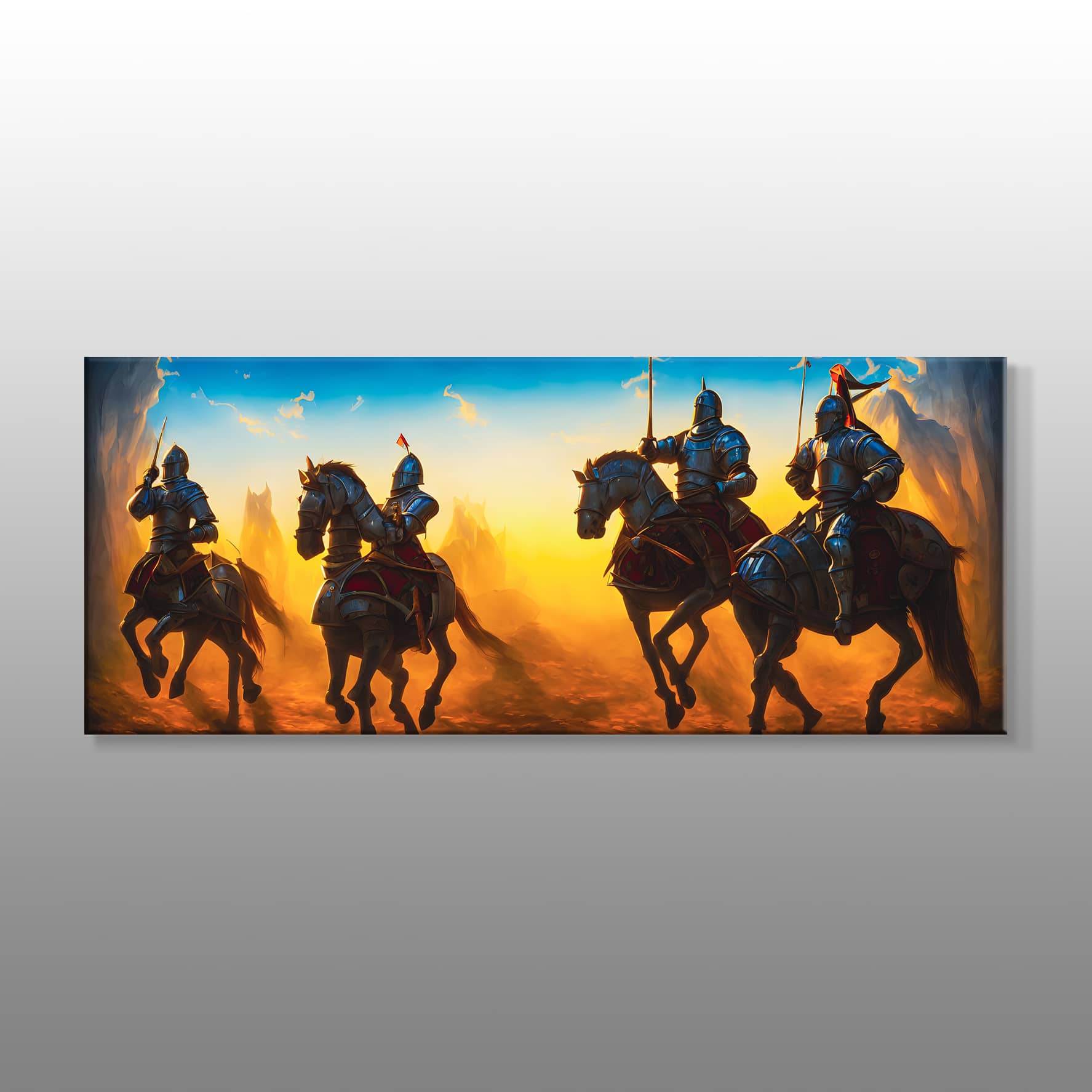 Siyah Atlı Mavi Şövalyeler Kanvas Baskı Tablo, şövalyelerin cesur bir şekilde ilerlediği bir ambiyans ile birlikte yaşam alanlarınızda epik bir masalın atmosferini oluşturacak. Her detayında düşündüren bu tablo, özellikle Orta Çağ’ın destansı ruhunu yansıtıyor. Aynı zamanda bu tablo, cesaretin ve efsanelerin buluştuğu bir sahneyi yansıtıyor. Bununla birlikte bu tablo, evinizin en dikkat çekici köşesi haline gelebilir. Özellikle şövalyelerin ihtişamıyla doku olan bu tablo, çeşitli detaylarıyla birlikte mistik ve güçlü bir aura oluşturur. Bununla beraber şövalyelerin her biri, standarttan uzak bir şekilde farklı detaylarla süslenmiştir. Galeri Gusto’nun siyah atlı mavi şövalyelerinin tüm detayı, yaşam alanınıza göz alıcı dekoratif bir unsur olmaya hazır. Hızlı bir şekilde sipariş vermek için iletişim kanallarımız üzerinden bize ulaşabilirsiniz.