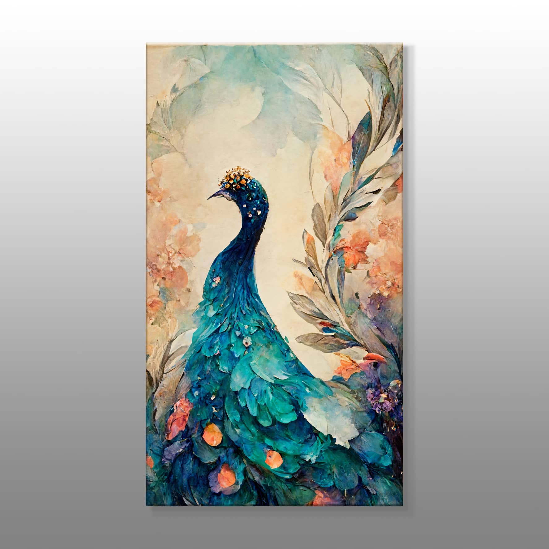 Sola Bakan Mavi Çiçek Kanatlı Tavus Kuşu Kanvas Baskı Tablo