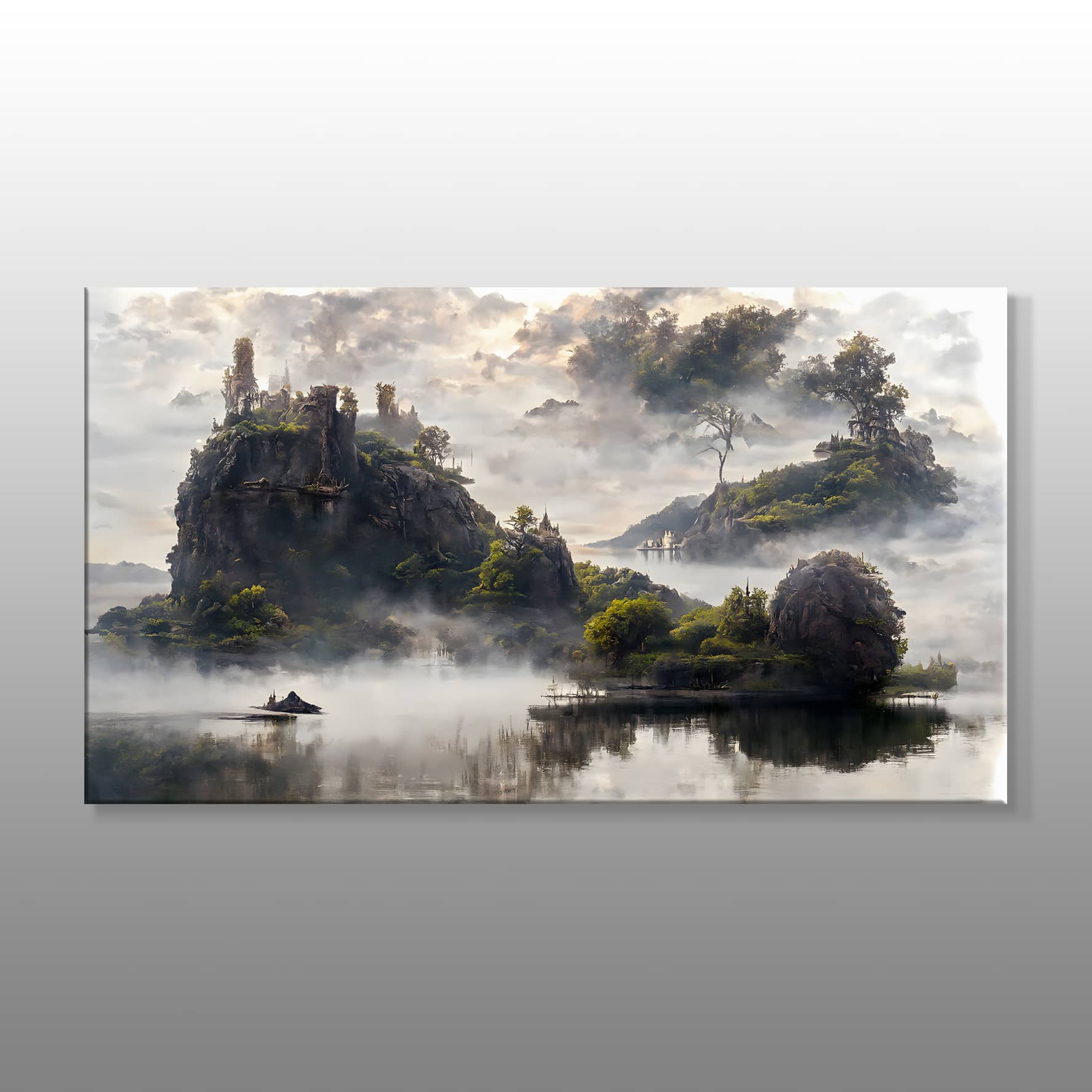 Tablodaki sisli hava, sakin gölet ve doğal adalar, bu manzarayı adeta bir masal diyarına dönüştürüyor. Aydınlık ve huzurlu bir atmosfer yaratarak, iç mekanınıza doğal bir zarafet katıyor. Bu tablo, özellikle oturma odası, dinlenme alanları veya ofislerde doğa ile iç içe bir ortam yaratmak isteyenler için mükemmel bir tercih olacak.