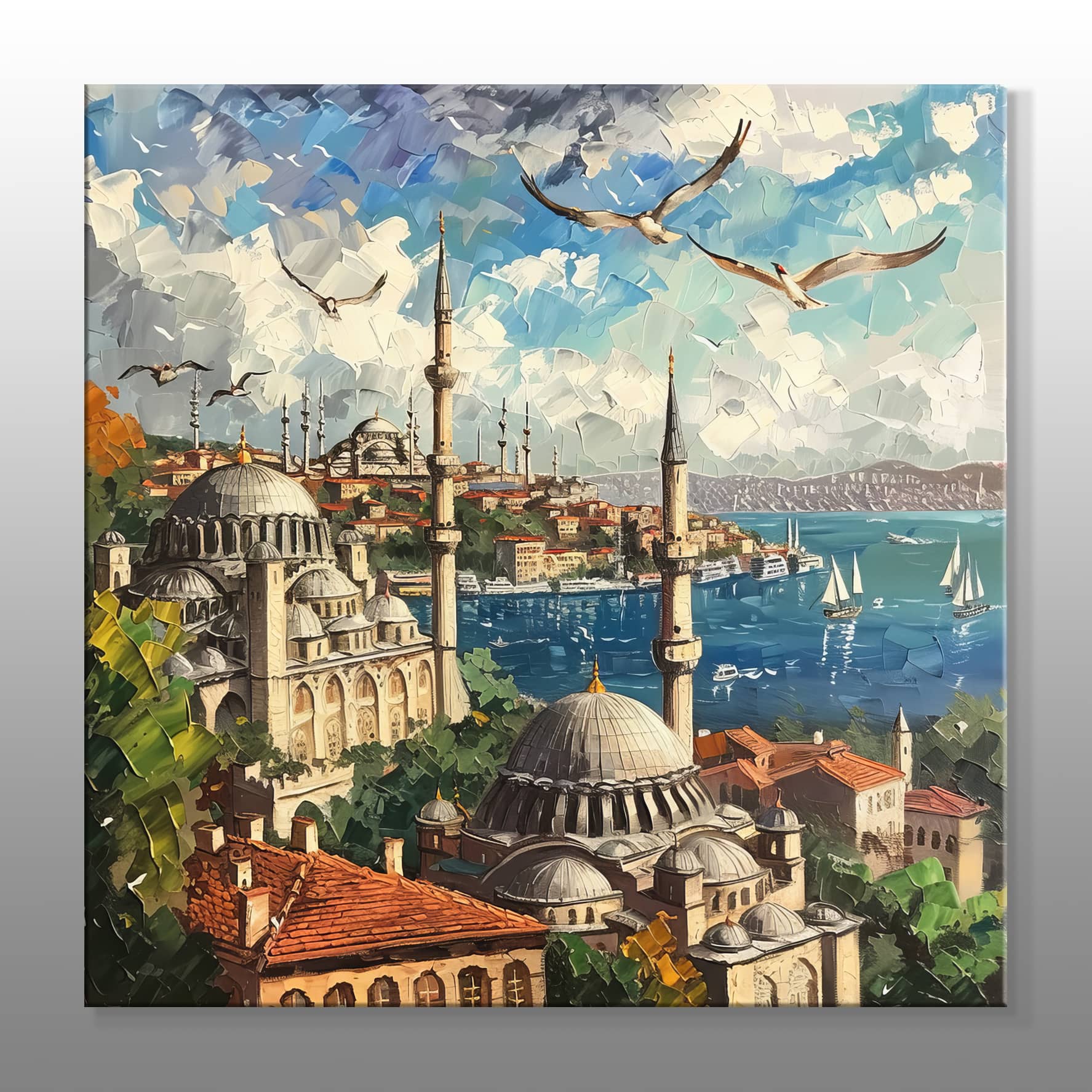 İstanbul’un simgesel yapılarını bir araya getiren bu manzara, hem nostaljik hem de modern bir atmosfer yaratıyor. Yumuşak ton geçişleri ve silüet halindeki detaylar, tabloya sakin ama etkileyici bir karakter kazandırıyor. Boğaz’ın huzur veren siluetiyle bütünleşen mimari dokular, şehrin geçmişiyle bugününü tek bir karede buluşturuyor.