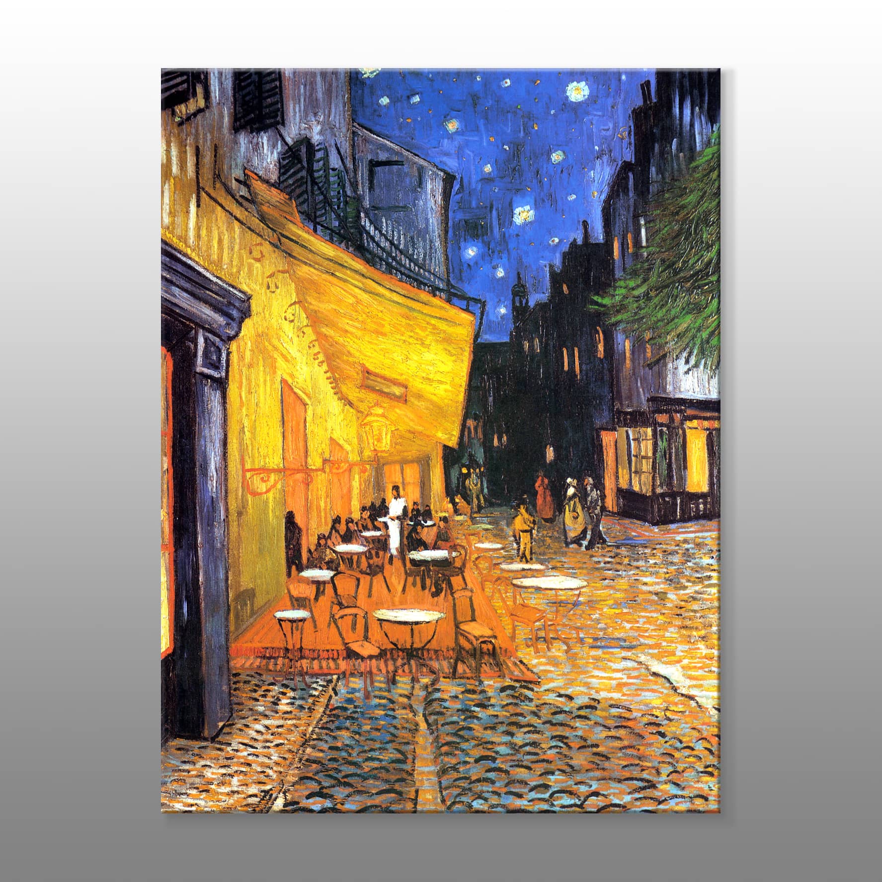 Vincent van Gogh’un 1888 yılında yaptığı Gece Kafe Terası, sanatçının en ikonik eserlerinden biridir ve onun ışık, renk ve atmosfer yaratma konusundaki ustalığını gözler önüne serer. Bu tablo, özellikle gece manzaralarındaki dramatik ışık kullanımı ve sıcak renk tonlarıyla dikkat çeker. Eser, bir kafe terasında geceyi yansıtırken, arka planda parlayan yıldızlar ve aydınlık bir gökyüzü ile çevrilidir. Sarı ve turuncu tonları, kafenin ışıklarını ve dış mekânın sıcak atmosferini vurgular, izleyiciyi adeta o anın içine çeker. Van Gogh, özellikle geceleri dışarıda geçirdiği zamanlarda ışık ve renk oyunları üzerinde yoğunlaşarak, bu tablosunda hem içsel bir huzur hem de dışarıdaki canlılığın bir sentezini oluşturur. Kafenin masalarında oturan insanlar, ışığın ve gölgelerin zarif şekilde dağıldığı şekilde betimlenmiştir. Arka plandaki gökyüzü, mavi ve sarı tonları ile oldukça canlıdır. Yıldızlar, Van Gogh’un ünlü "Yıldızlı Gece" tablosundaki gibi büyük bir vurgu ile belirgindir, geceye mistik bir hava katmaktadır.