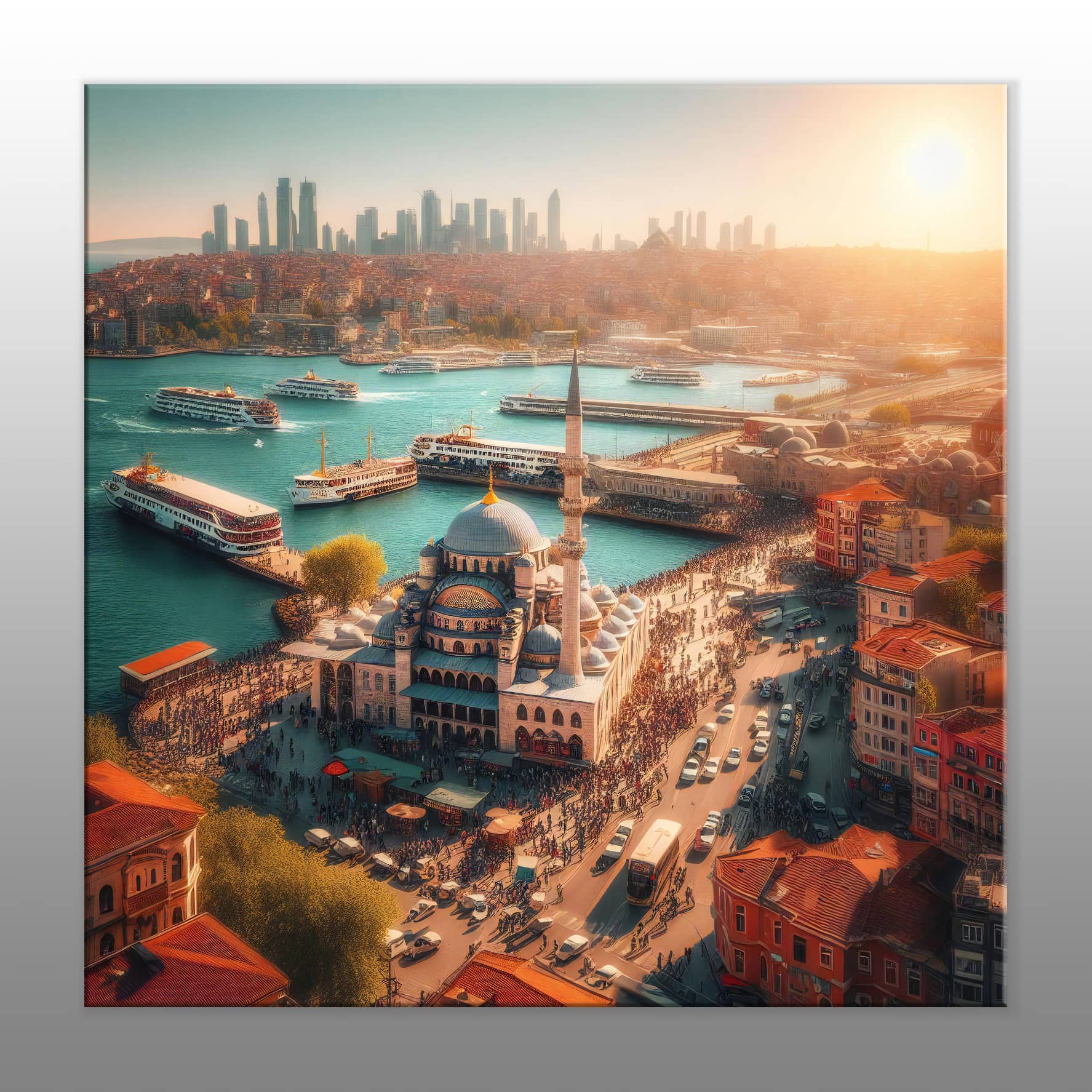 Yeni Cami Kuşbakışı Kanvas Baskı Tablo, İstanbul’un siluetinin en güzel yansıması olan Yeni Cami’yi gözler önüne seriyor. Şehri yüksekten izleyen bir perspektif ile caminin ihtişamını, zarif kubbelerini ve minarelerini detaylı bir şekilde sunan bu tablo, İstanbul’un tarihi dokusunu evinize taşıyor. Yeni Cami, hem mimarisiyle hem de çevresindeki tarihi yapılarla, izleyiciyi adeta zamanda bir yolculuğa çıkarıyor. Bu eşsiz tablo, modern dekorasyonunuza zarif bir dokunuş katmak için mükemmel bir seçenek. Hem mimari hayranları hem de İstanbul’a olan sevgisiyle tanınanlar için ideal bir hediye ve dekoratif öğe sunuyor. Canlı renkler ve detaylar, mekânınızda huzurlu bir atmosfer yaratırken, tarihi bir eserin zarif bir yansımasını evinize taşır.